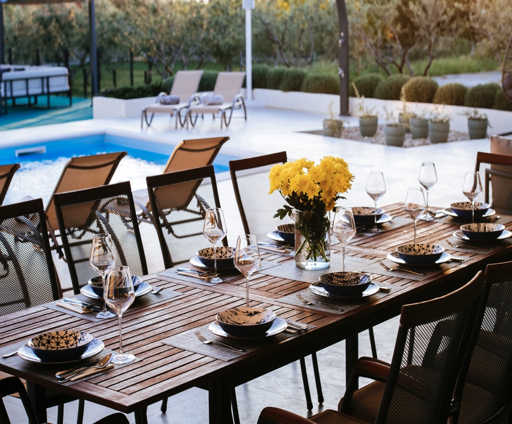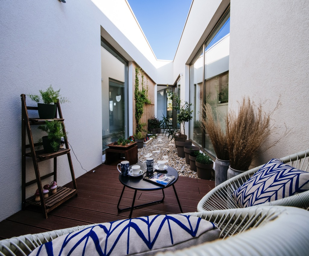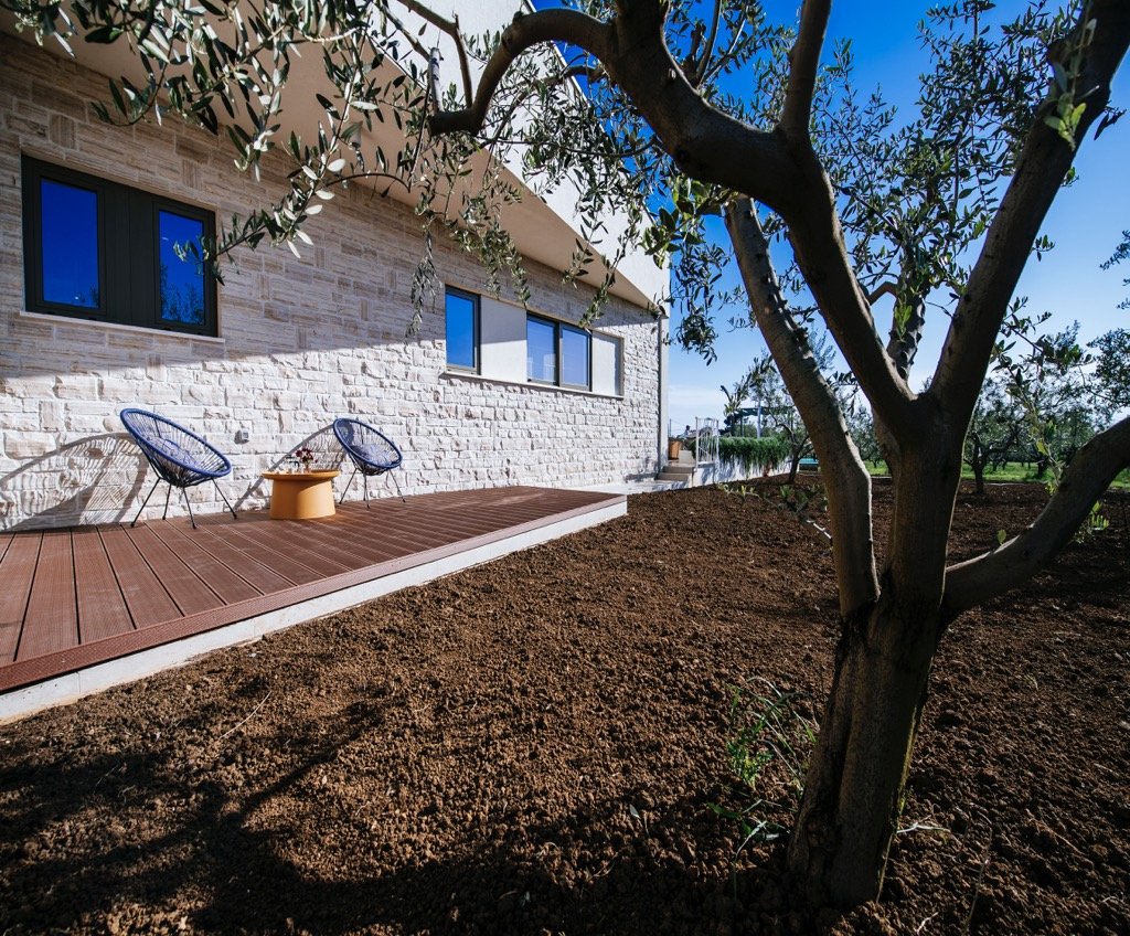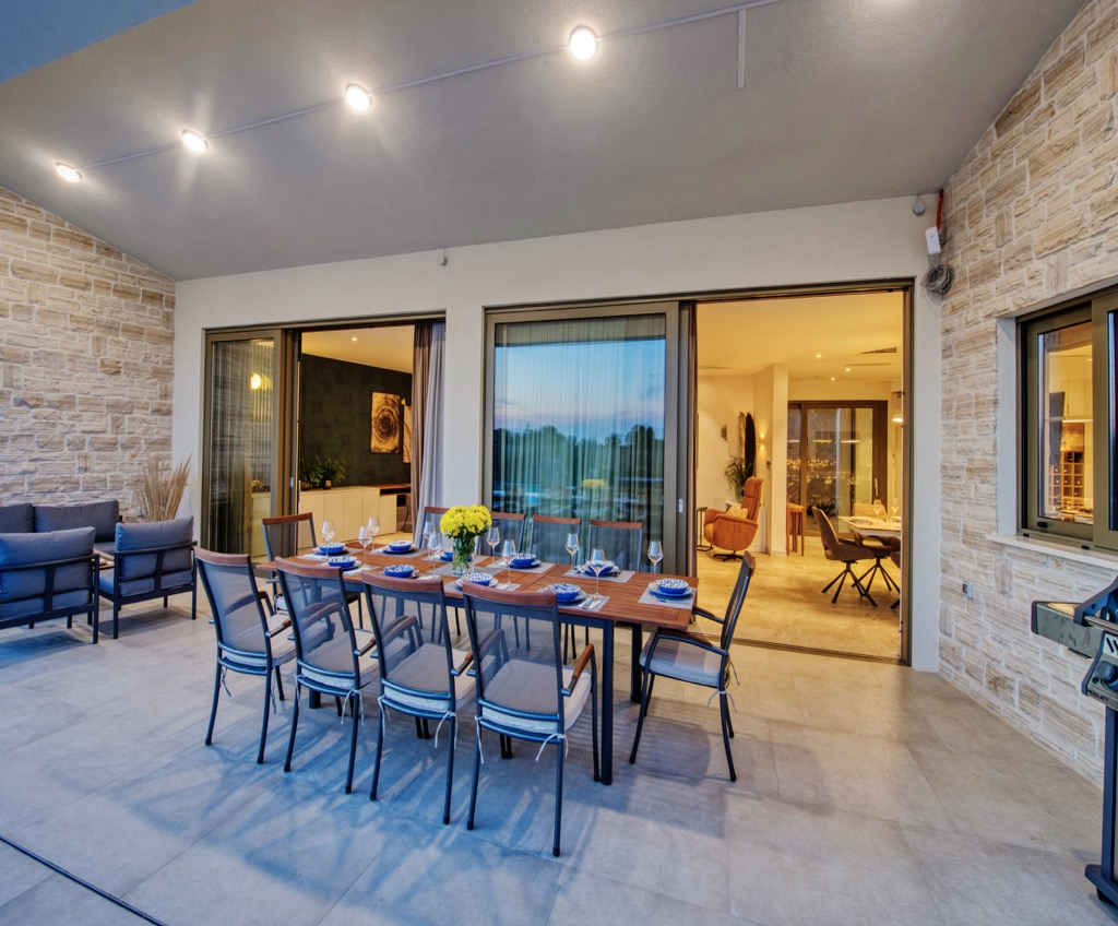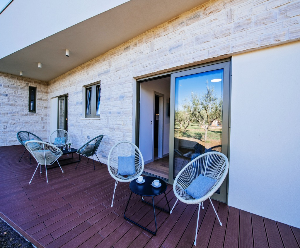 Den rummelige terrasse, der fungerer som opholdsområde, er forbundet med et separat gæstehus og passer harmonisk ind i det overordnede design.