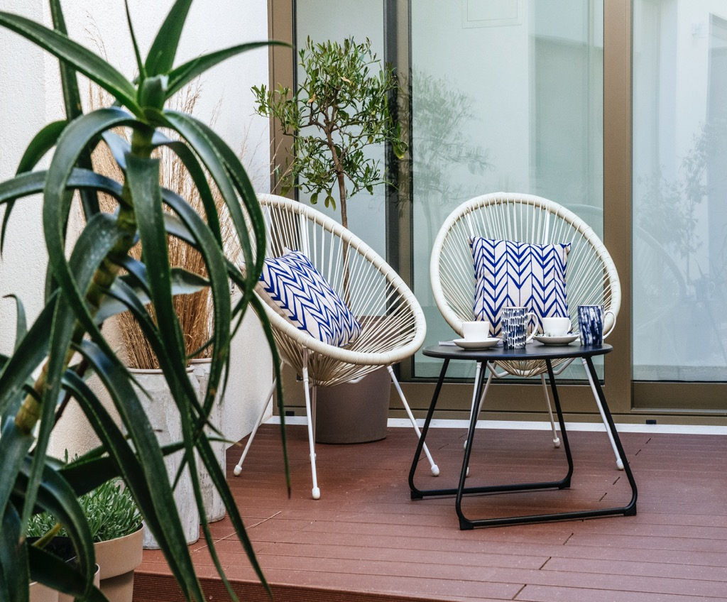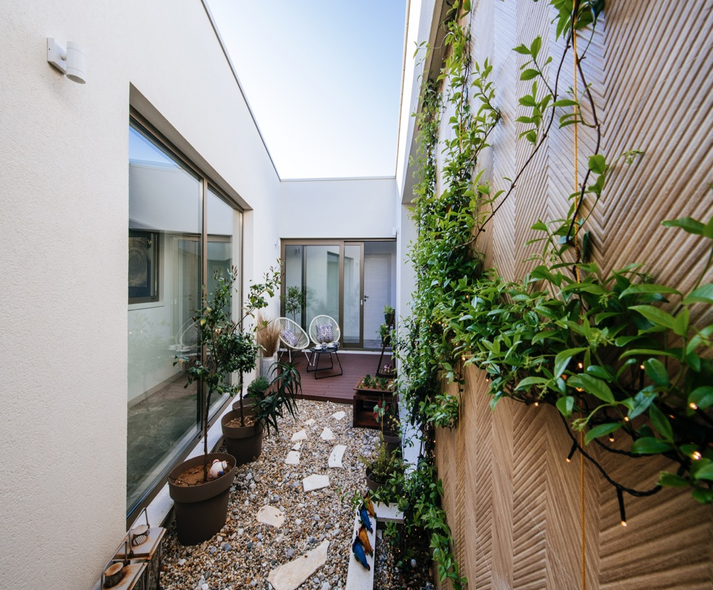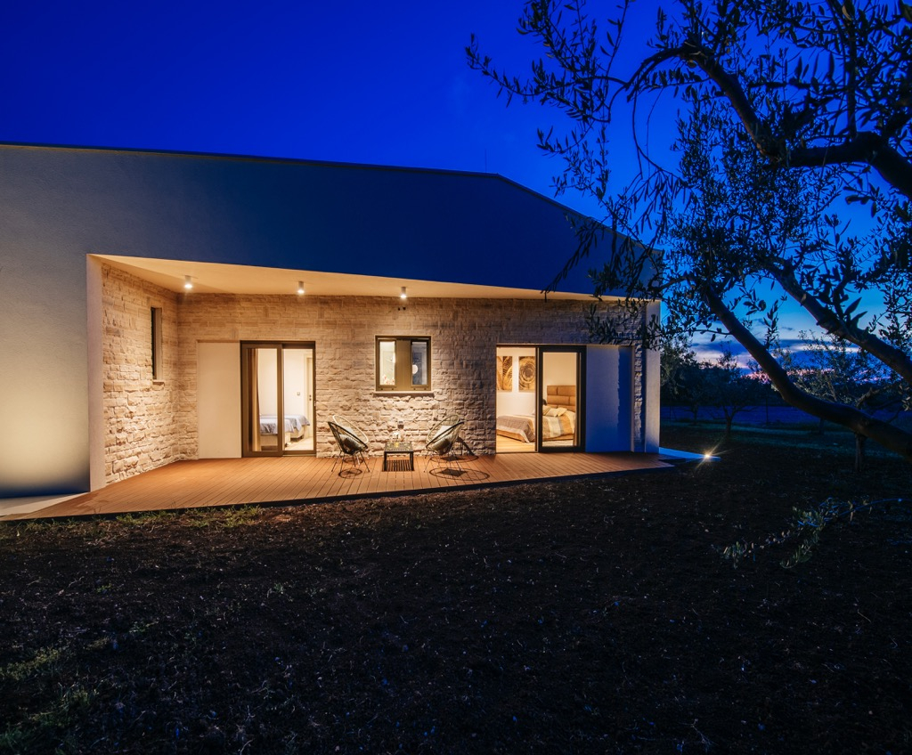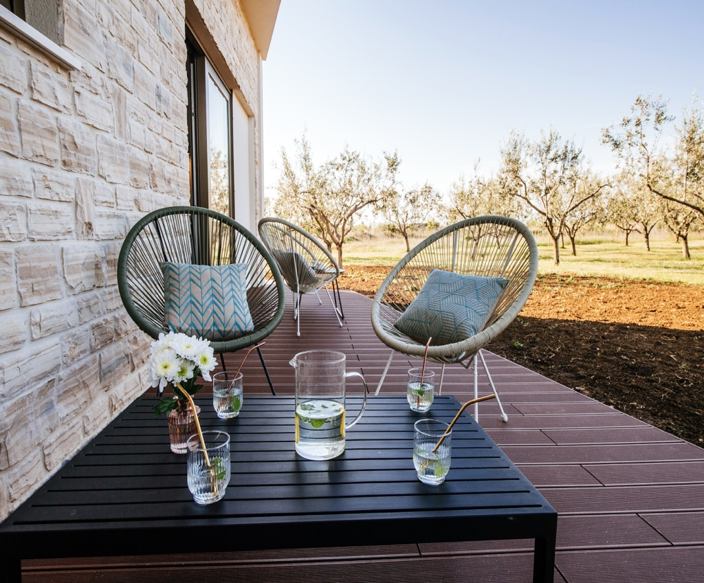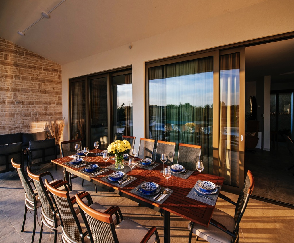 Den rummelige terrasse, der fungerer som opholdsområde, er forbundet med et separat gæstehus og passer harmonisk ind i det overordnede design.