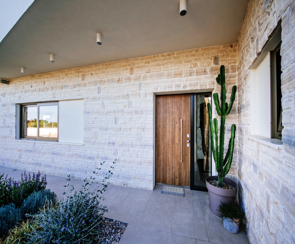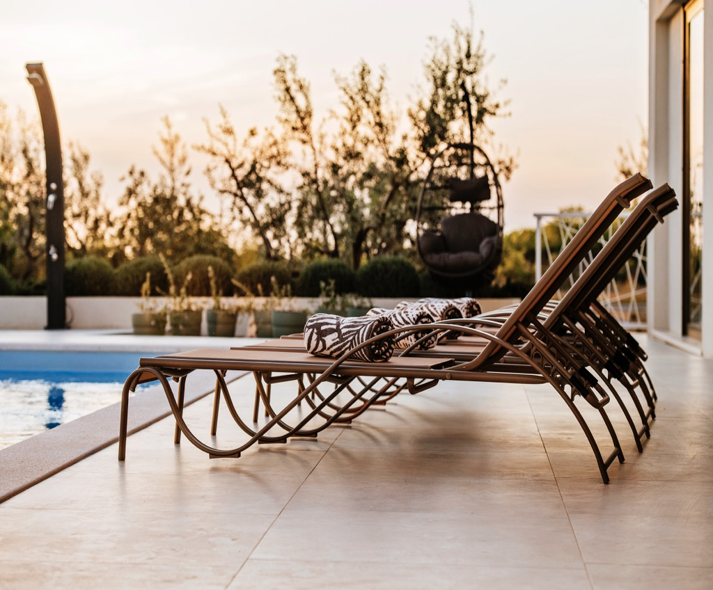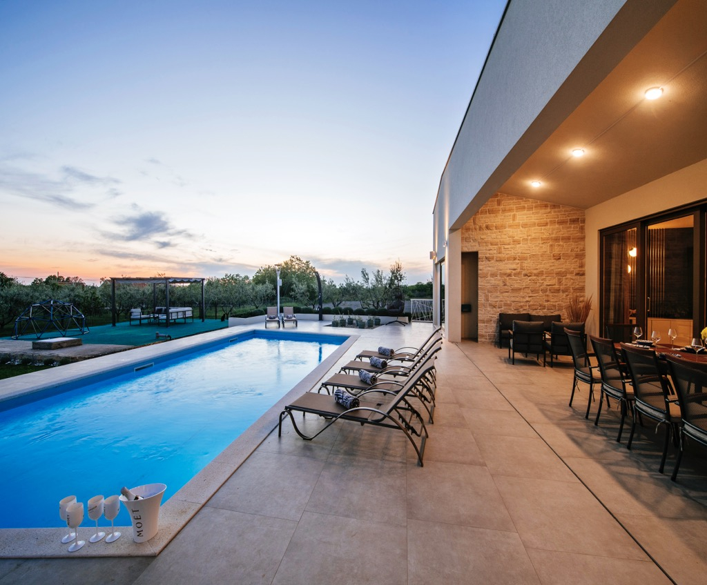 Det har en rektangulær swimmingpool på en uregelmæssigt formet terrasse.