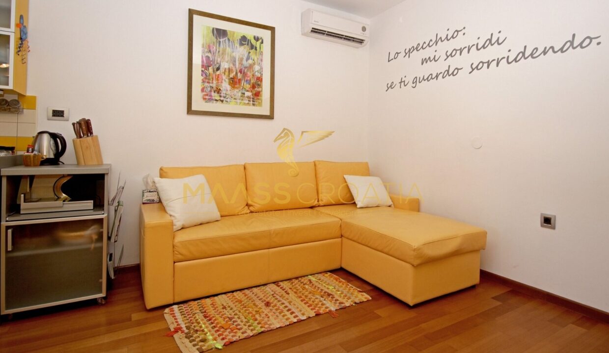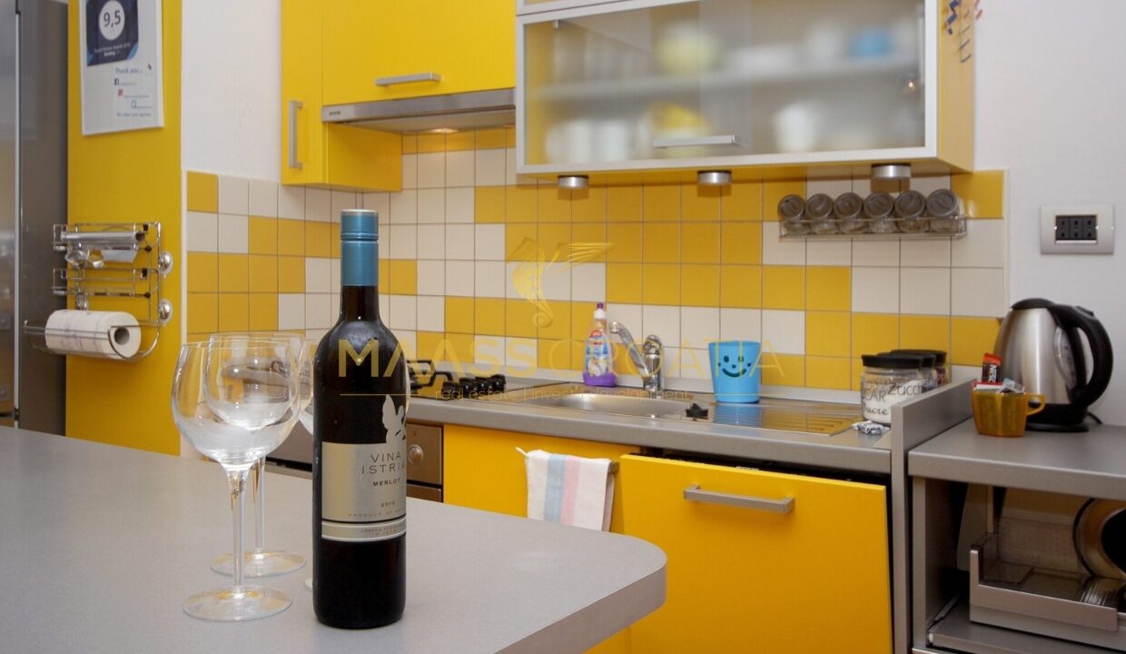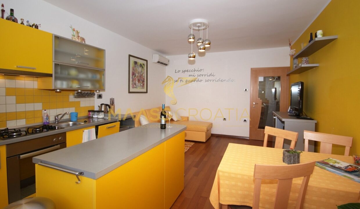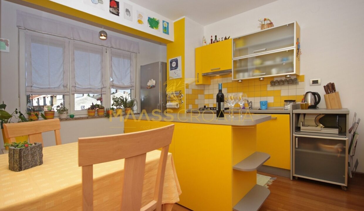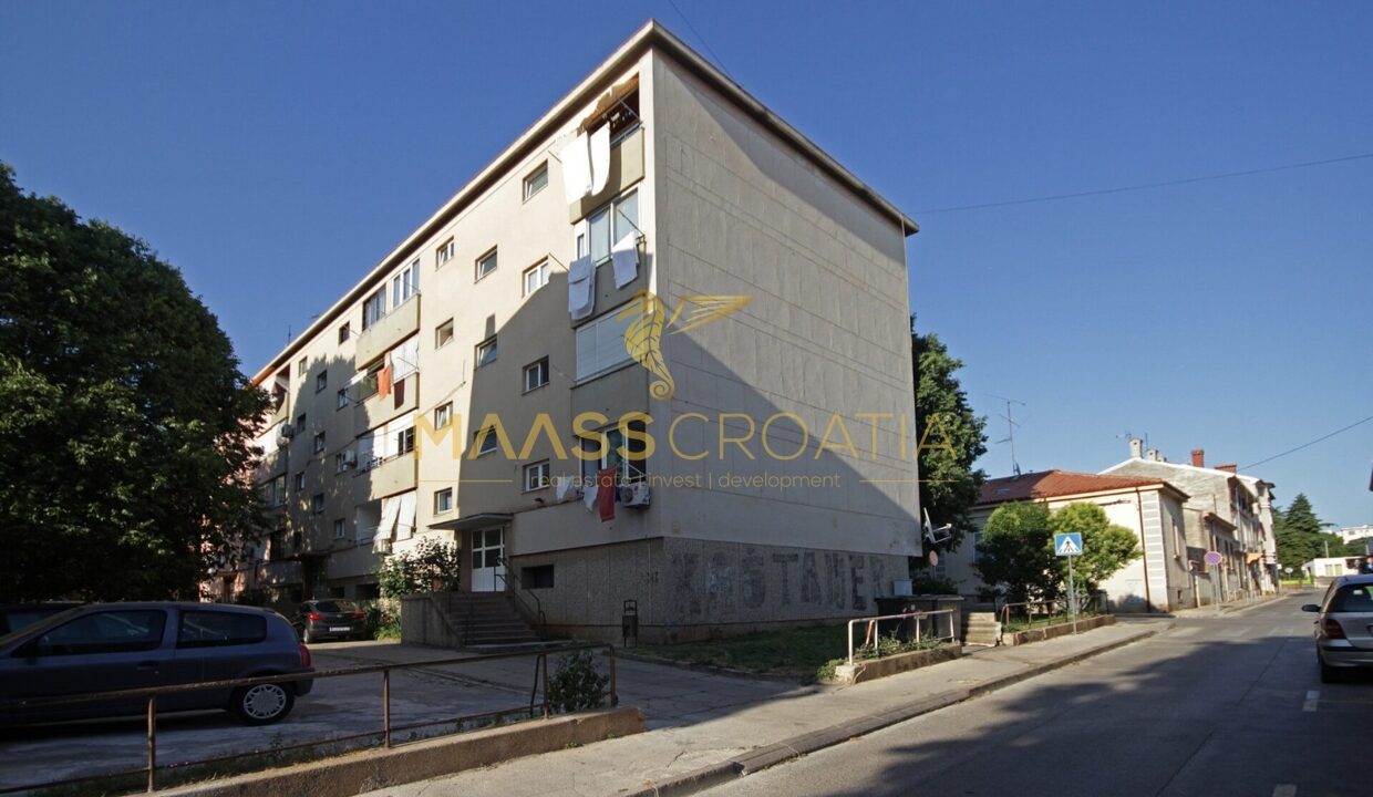 Denne lyse og velindrettede lejlighed på 62 kvadratmeter ligger på anden sal i en velholdt bygning i Pula, kun omkring to kilometer fra havet.