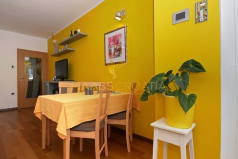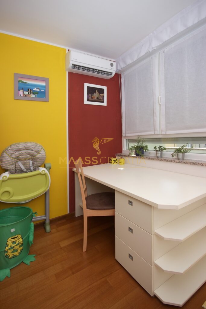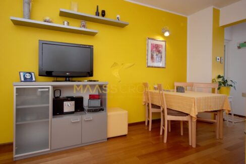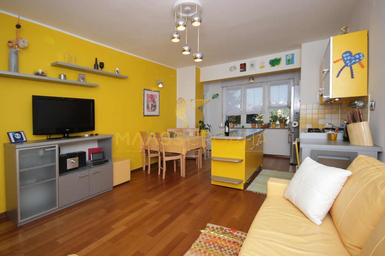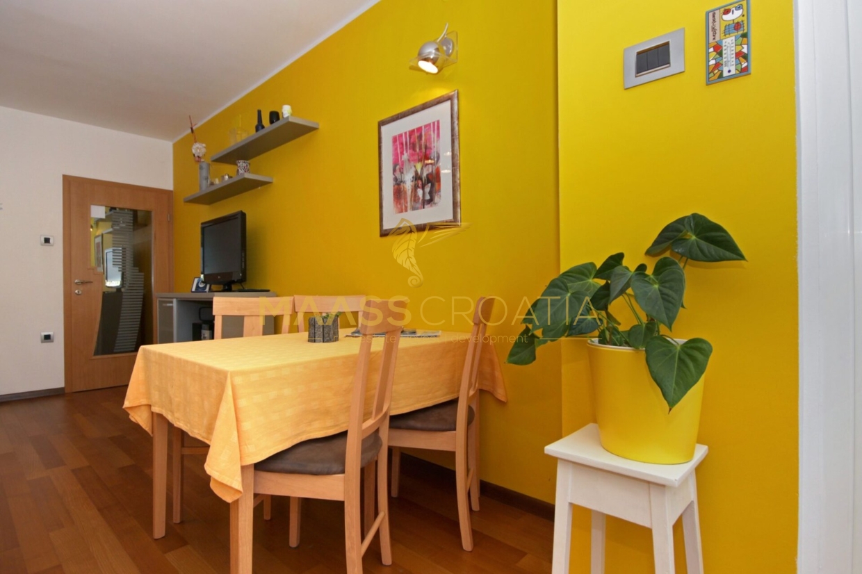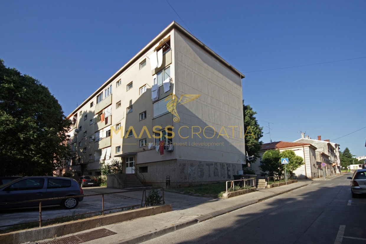 Denne lyse og velindrettede lejlighed på 62 kvadratmeter ligger på anden sal i en velholdt bygning i Pula, kun omkring to kilometer fra havet.