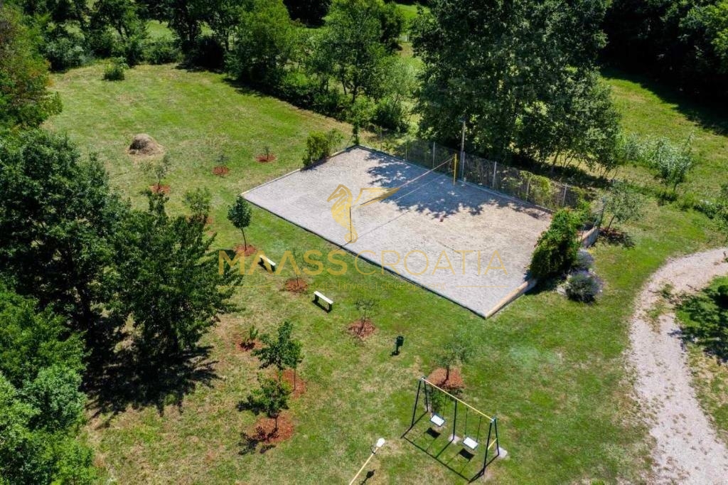 Alt er afsluttet med ekstra indhold til udendørs nydelse, såsom en børne- og volleyballlegeplads, en grill og to store swimmingpools med liggestole, adskilt for hvert hus.