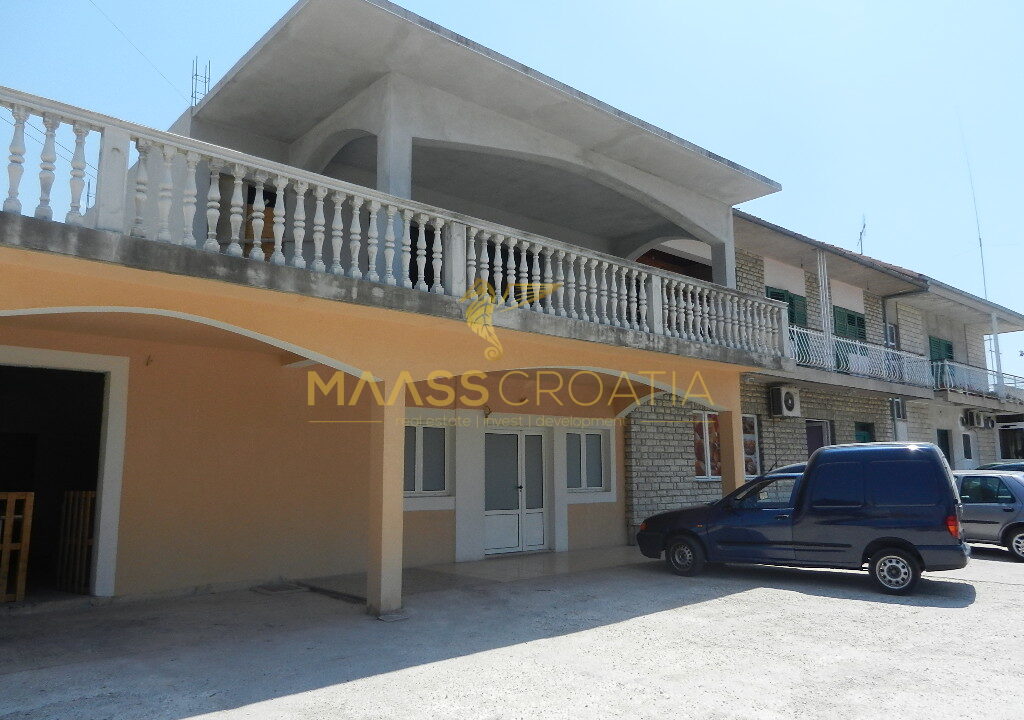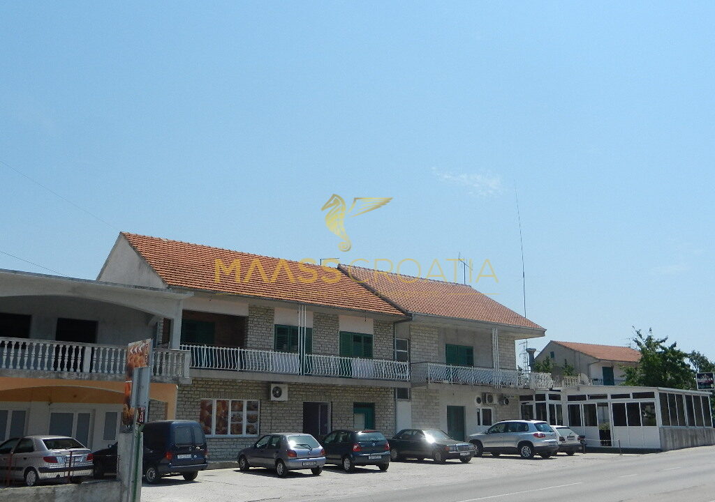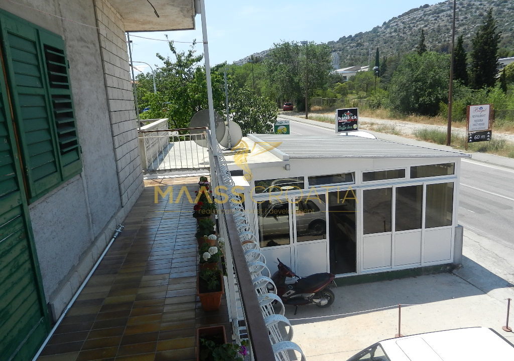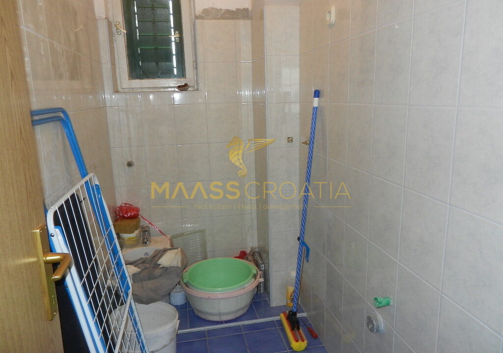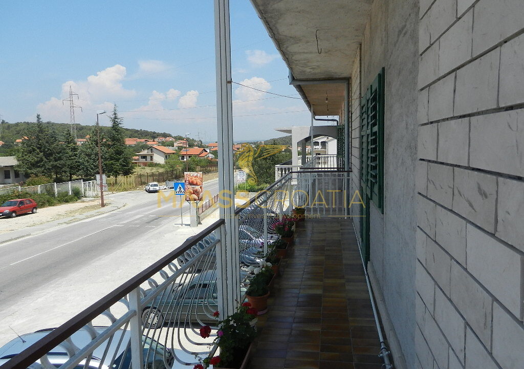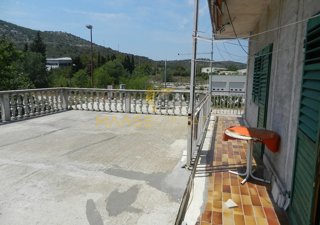 Den indvendige trappe fører til 1. sal, hvor der er tre boligenheder på i alt 241,49 m2. Lejlighed S1 indrettet og indflytningsklar med et areal på 100,86 m2, bestående af køkken med spisestue og stue som helhed, entre, badeværelse, toilet og 4 soveværelser + altan på 21,31 m2. Lejlighed S2 indrettet og indflytningsklar med et areal på 68,63 m2, bestående af køkken med spisestue og stue som helhed med udgang til terrasse på 70,92 m2, depotrum, soveværelse og badeværelse samt en altan på 10,92 m2. Lejlighed S3 med et areal på 72 m2 installeret i skalkonstruktion med del af PVC-tømrer + en stor terrasse på 72 m2 og en loggia på 28 m2. med sætning. Grunden på 742 m2 er indhegnet og parkeringspladsen er foran bygningen. Centrum af Šibenik og havet ligger 3 km derfra.