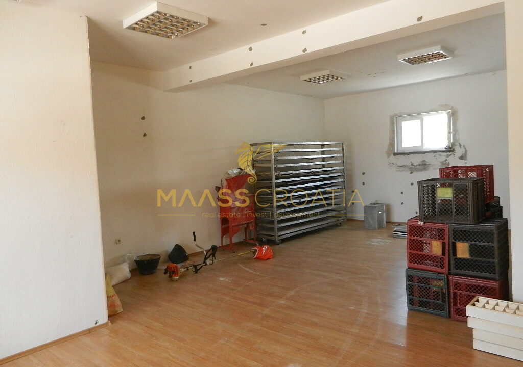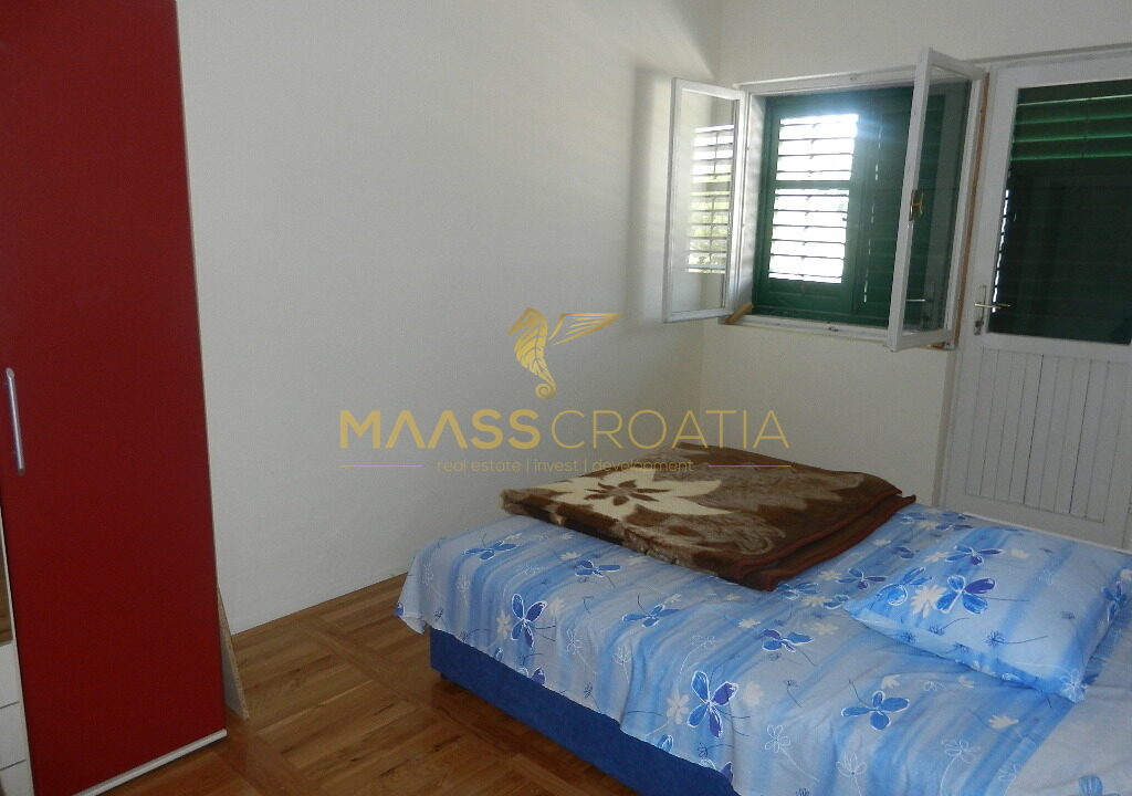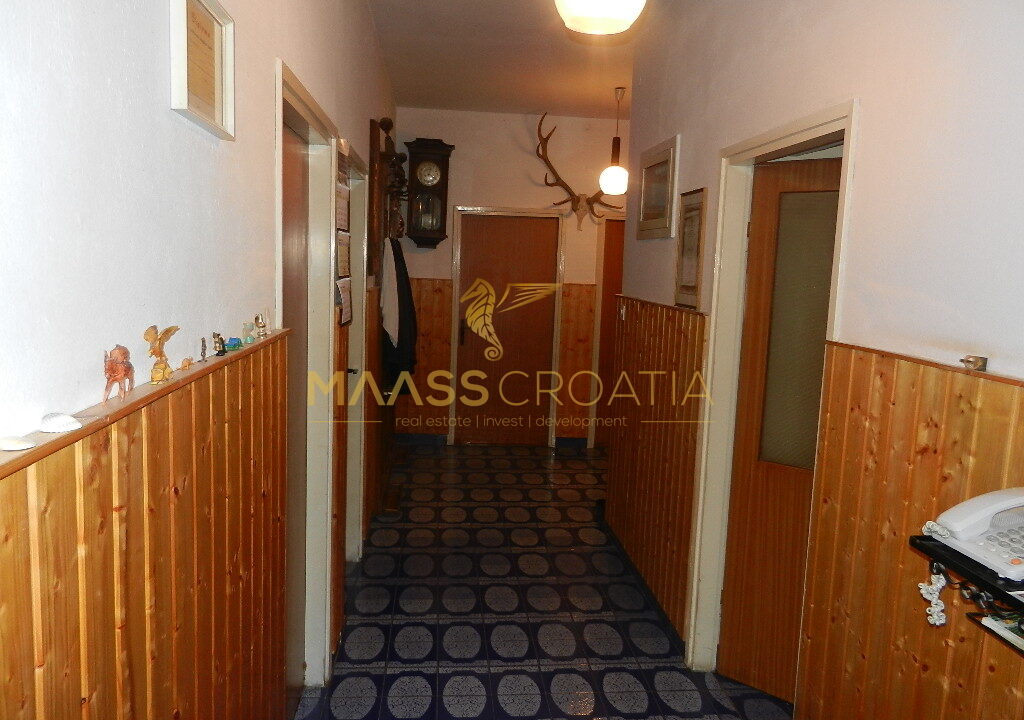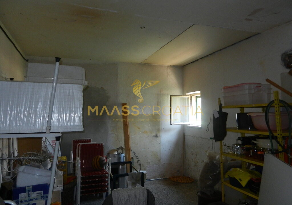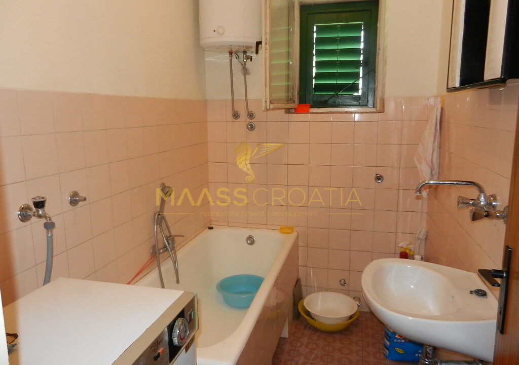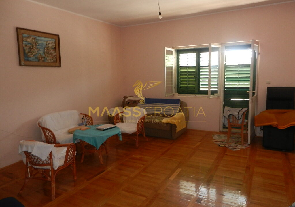 Den indvendige trappe fører til 1. sal, hvor der er tre boligenheder på i alt 241,49 m2. Lejlighed S1 indrettet og indflytningsklar med et areal på 100,86 m2, bestående af køkken med spisestue og stue som helhed, entre, badeværelse, toilet og 4 soveværelser + altan på 21,31 m2. Lejlighed S2 indrettet og indflytningsklar med et areal på 68,63 m2, bestående af køkken med spisestue og stue som helhed med udgang til terrasse på 70,92 m2, depotrum, soveværelse og badeværelse samt en altan på 10,92 m2. Lejlighed S3 med et areal på 72 m2 installeret i skalkonstruktion med del af PVC-tømrer + en stor terrasse på 72 m2 og en loggia på 28 m2. med sætning. Grunden på 742 m2 er indhegnet og parkeringspladsen er foran bygningen. Centrum af Šibenik og havet ligger 3 km derfra.