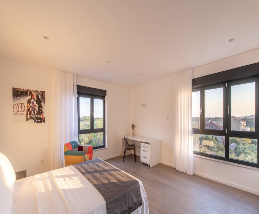 Højt til loftet og brede vinduer oversvømmer rummet med lys og forbedrer stemningen i hele ejendommen.