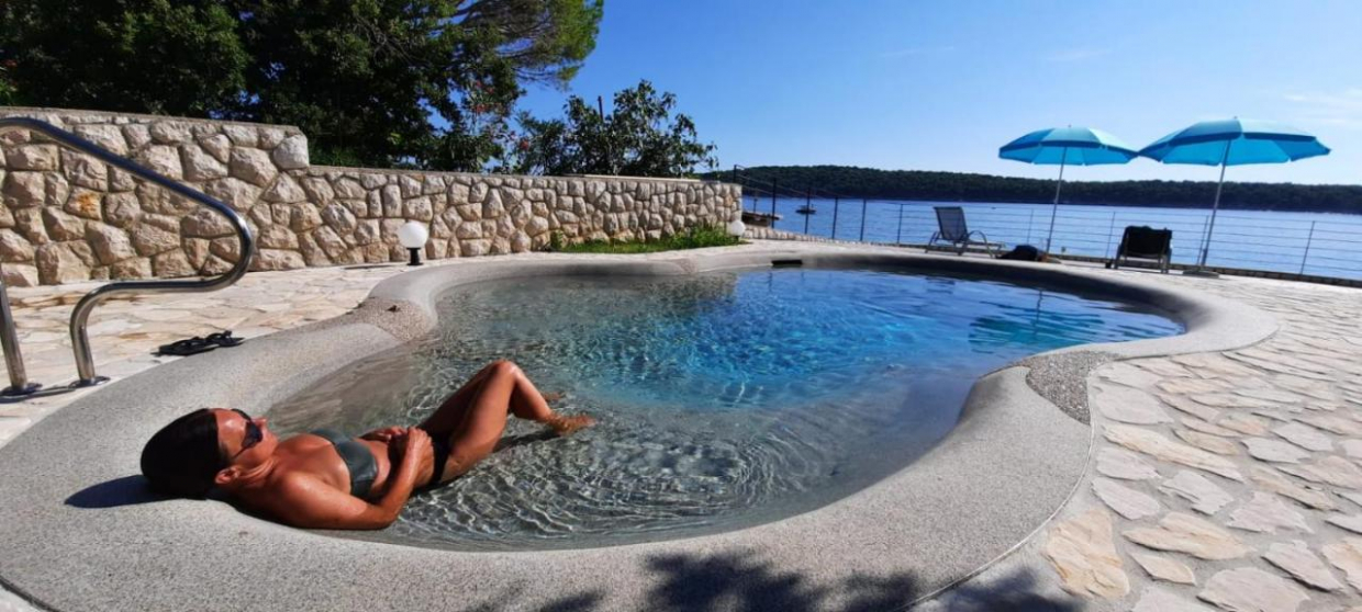 Husets ydre har en terrasse, perfekt til afslapning eller underholdning i sommermånederne. En swimmingpool med udsigt over havet og den nærliggende ø fuldender denne ejendom, hvilket gør den til en sand fornøjelse! Villaen inkluderer en privat parkeringsplads med syv pladser.
