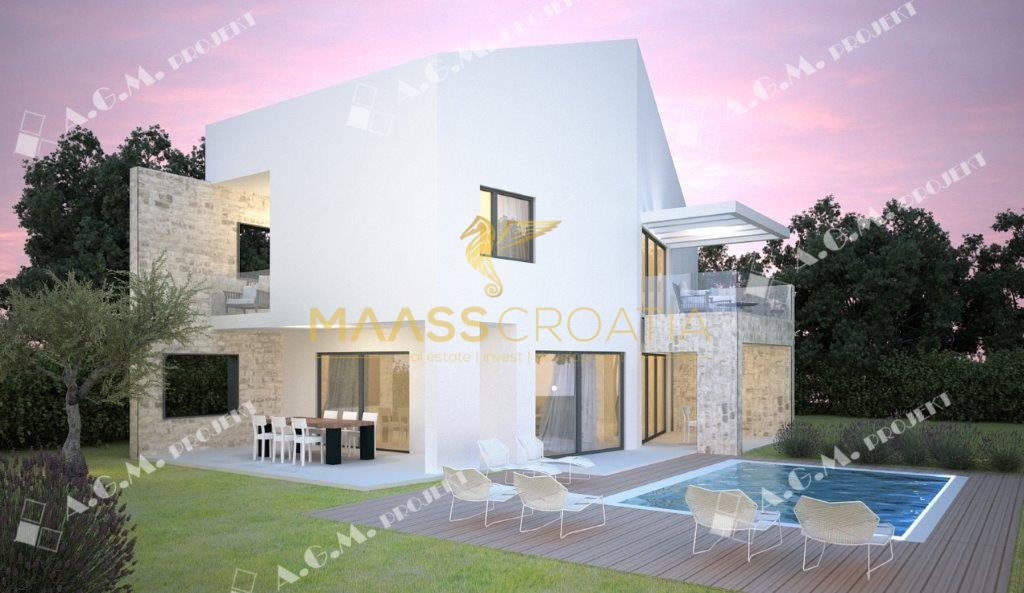 Nyopført, moderne villa med infinity-pool og panoramaudsigt over havet i Kaštelir. Villaen tilbyder en enestående...