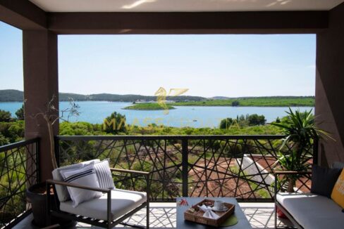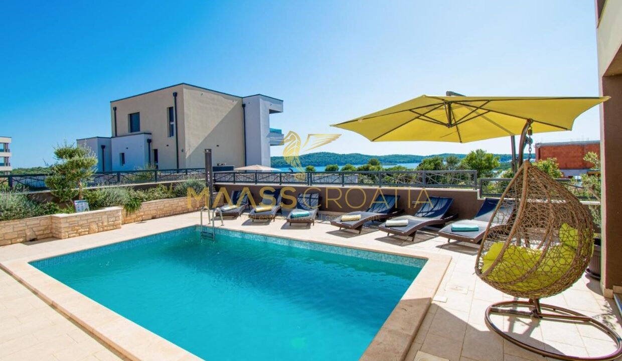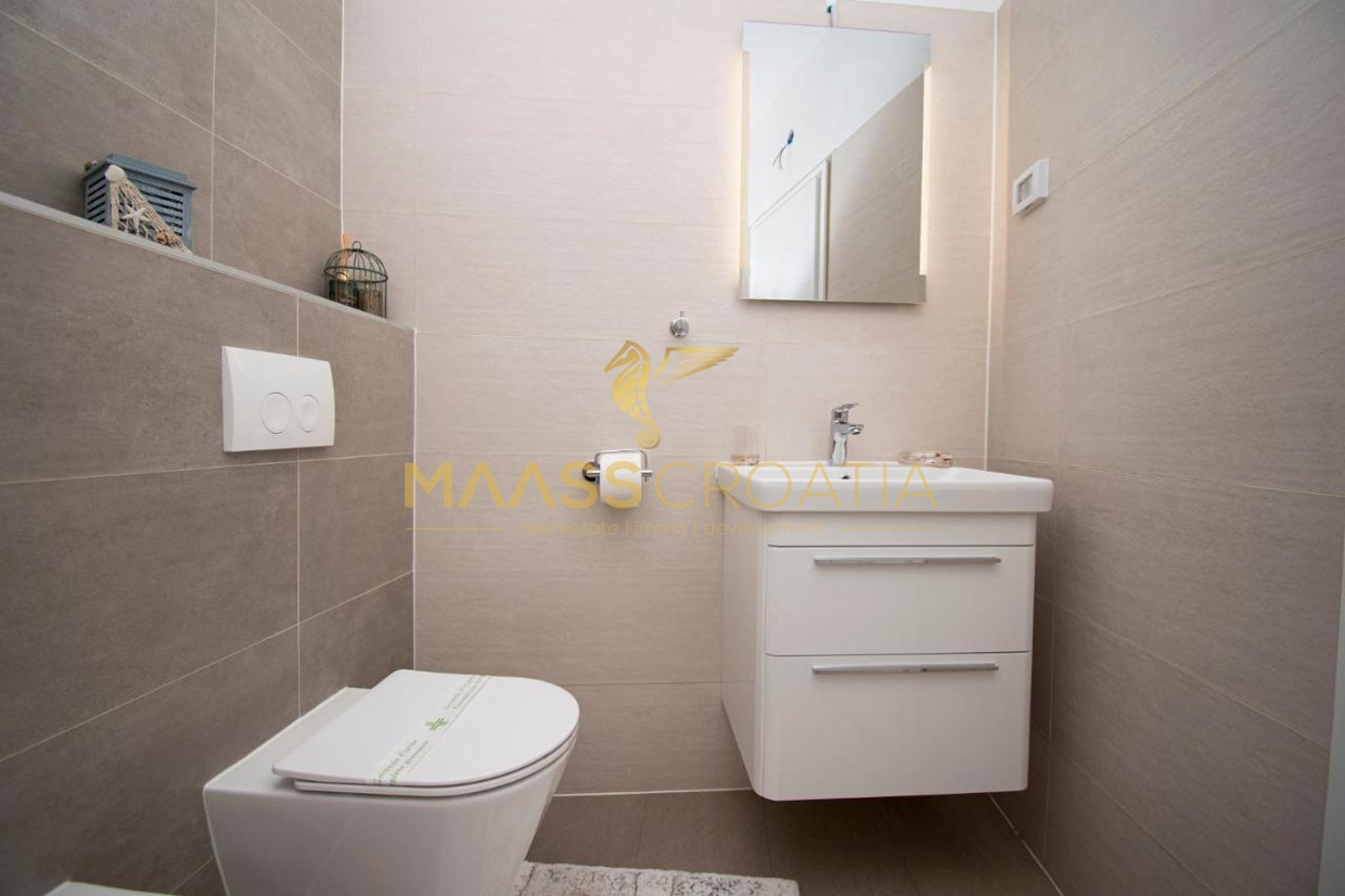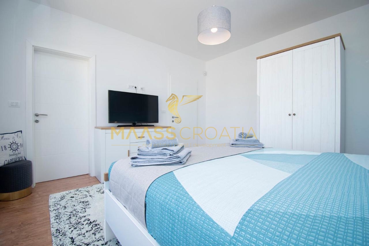 Til salg er et luksuriøst parcelhus med et areal på 200 m² og en smuk havudsigt, beliggende i Medulin, kun 150 meter fra havet og stranden.