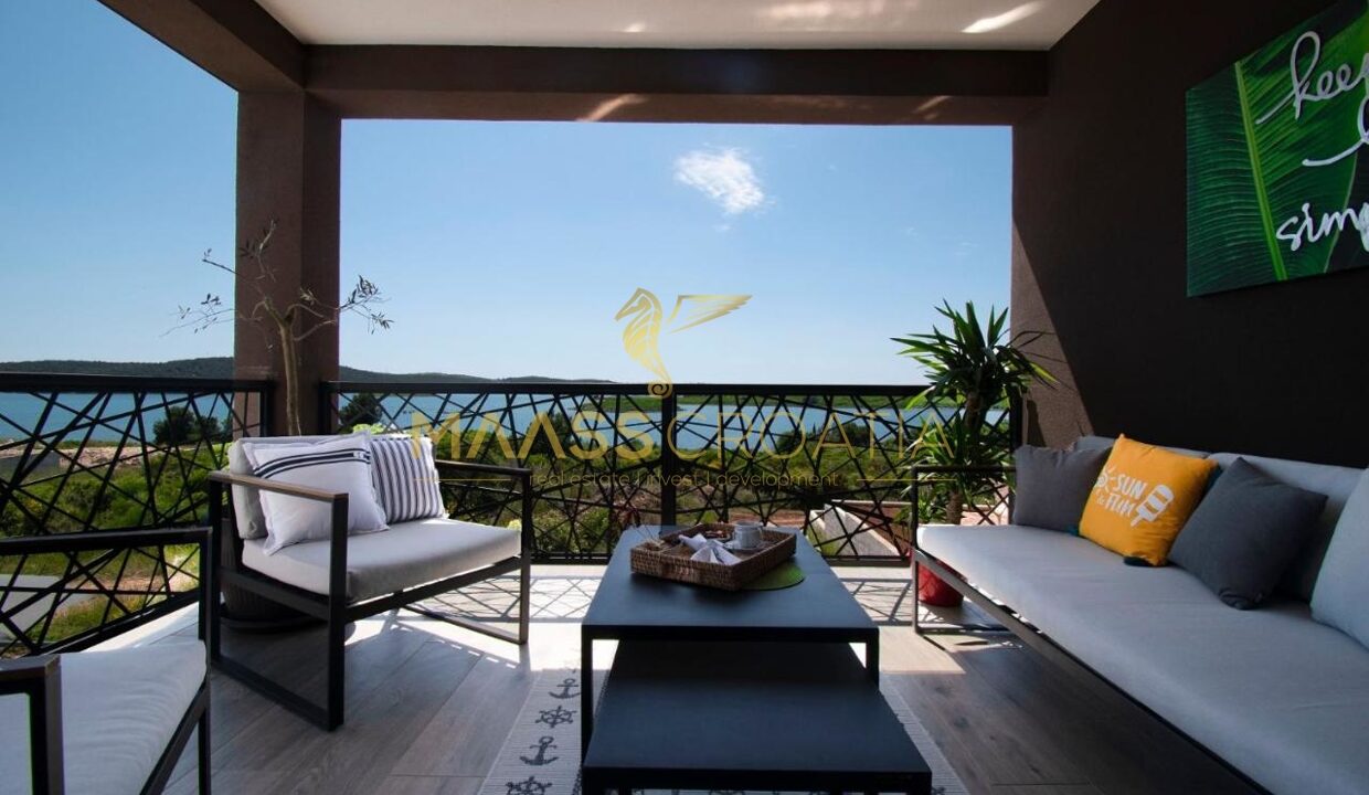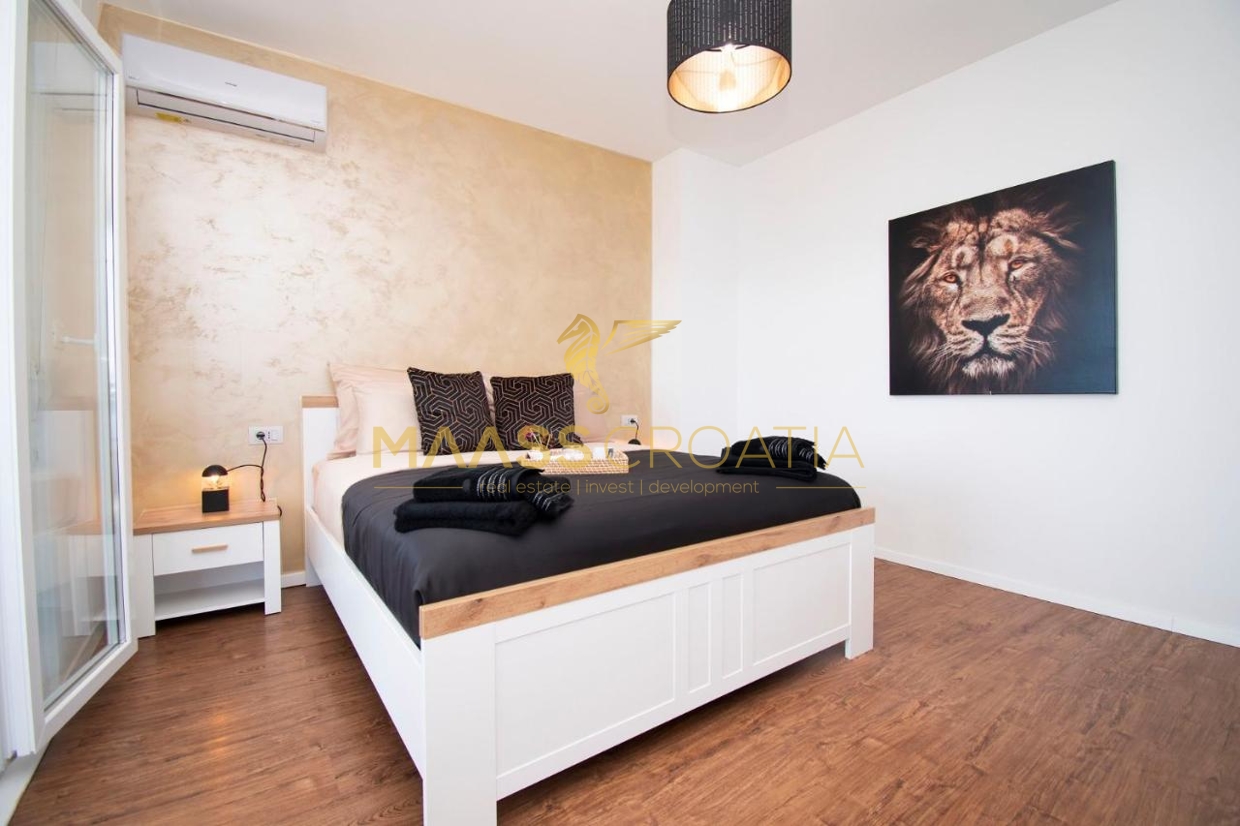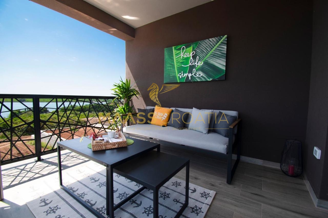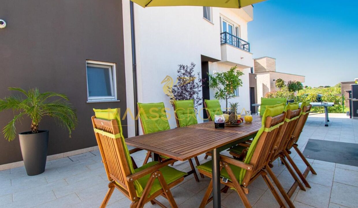 Til salg er et luksuriøst parcelhus med et areal på 200 m² og en smuk havudsigt, beliggende i Medulin, kun 150 meter fra havet og stranden.