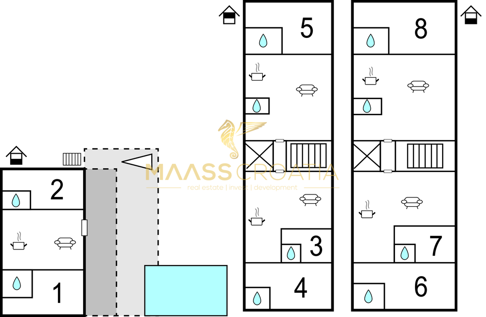 Huset består af fem fuldt møblerede boligenheder udstyret med alt ekstraudstyr.