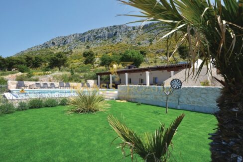 På den 1500 m² store ejendom har gæsterne adgang til pool, legeplads, græsplæne og udendørs grill.