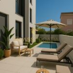 Moderne lejlighed i en nybygning med swimmingpool og have