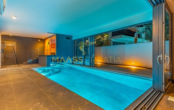 Den består af en rummelig stue med køkken og spiseområde, et soveværelse, en sauna med bruser samt en indendørs/udendørs pool i stueetagen.
