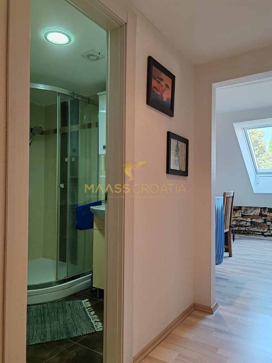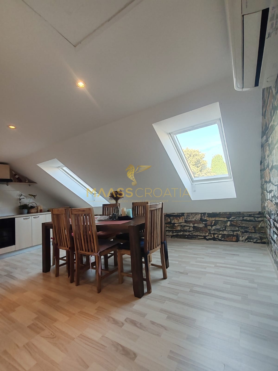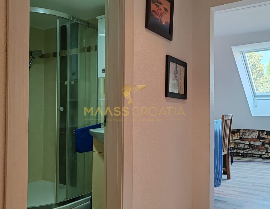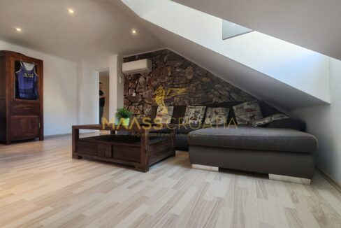Den består af et soveværelse, en rummelig stue, et køkken med spiseplads, et badeværelse og et opbevaringsrum. Den er udstyret med Velux tagvinduer med fjernbetjening, aircondition og laminatgulv i hele lejligheden.