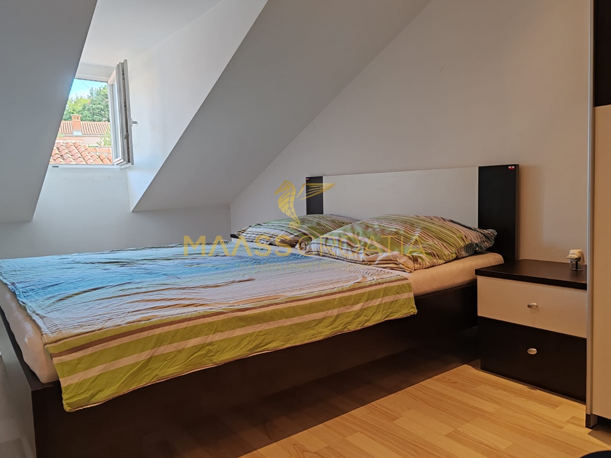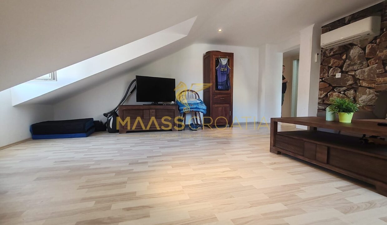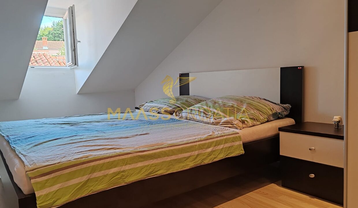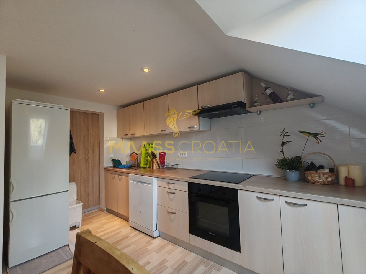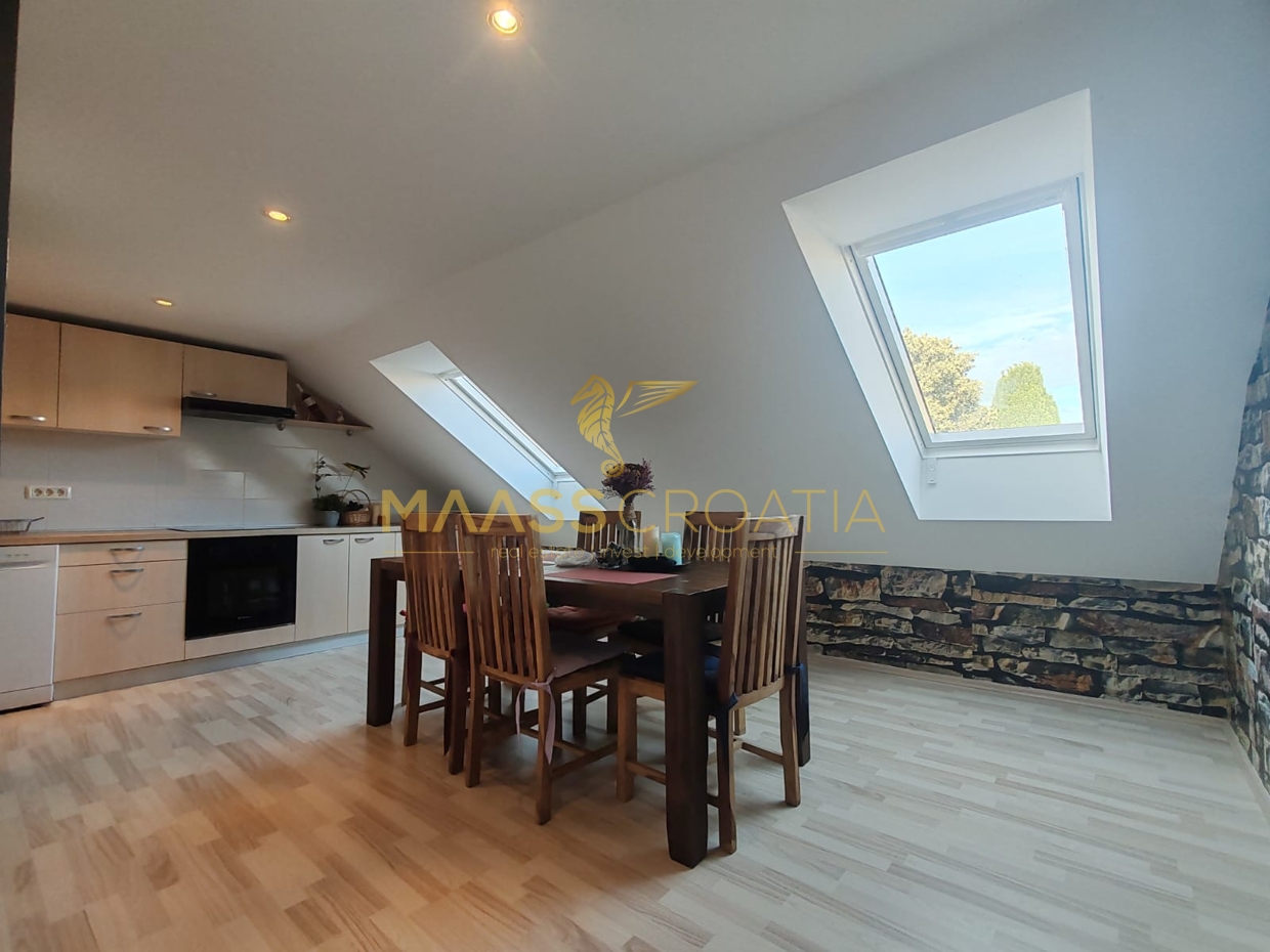 Lejligheden ligger på loftsetagen i en bygning med to etager og sælges møbleret.