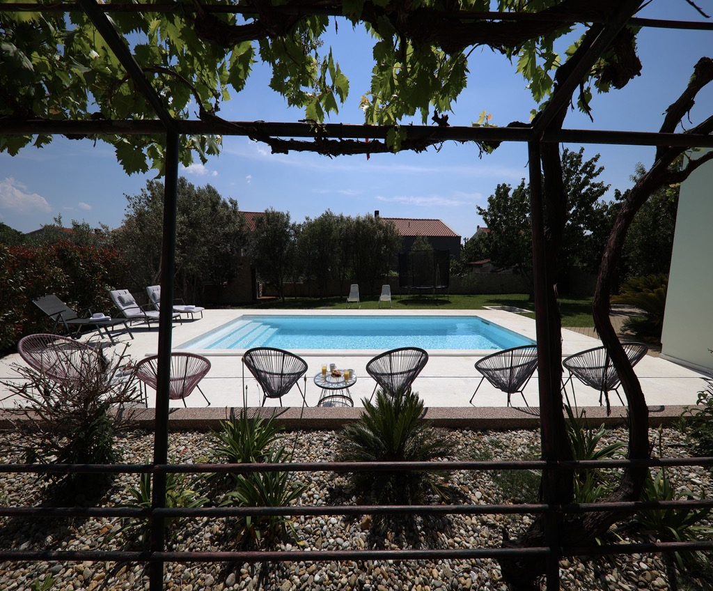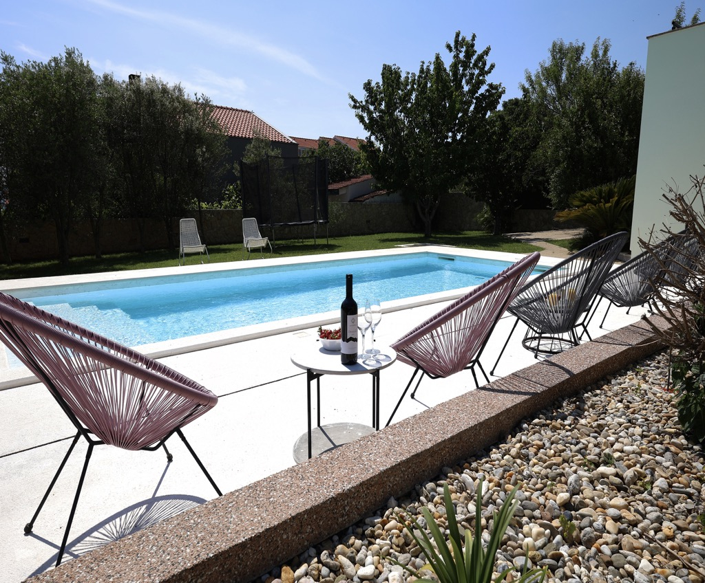 Fra den rummelige terrasse har du adgang til en stor swimmingpool og et lille haveområde.