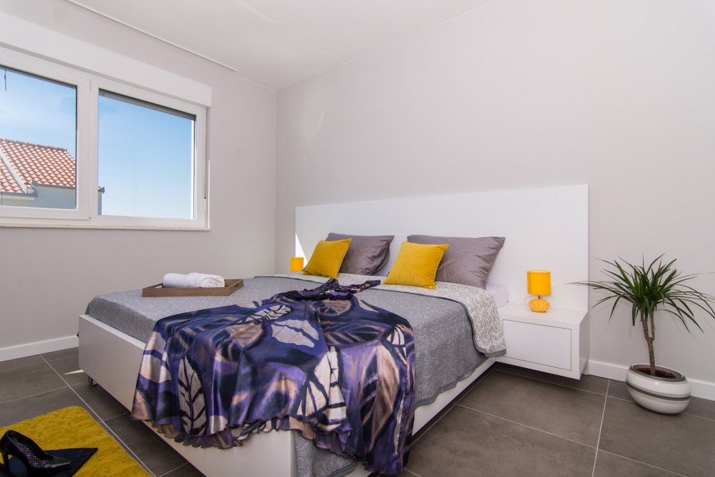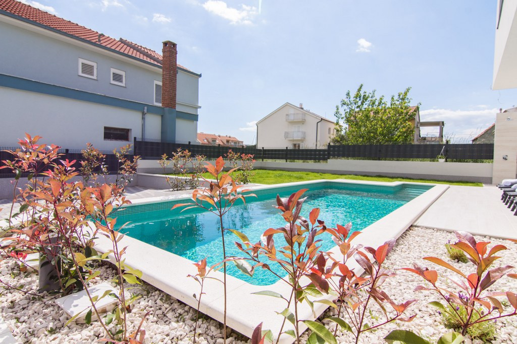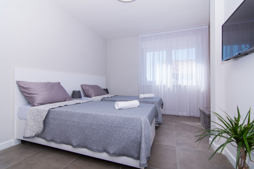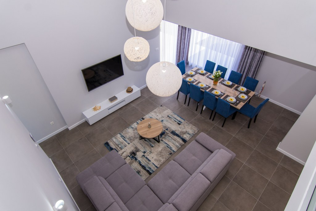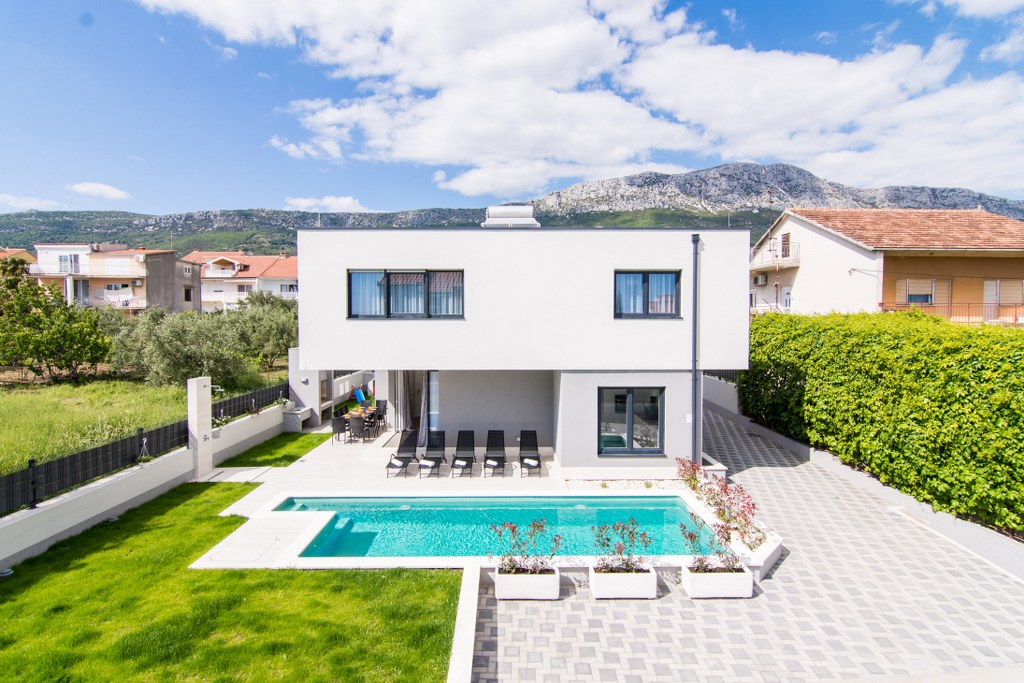 Den rummelige swimmingpool på terrassen i stueetagen er uden tvivl højdepunktet og giver den ideelle ramme for sociale sammenkomster med venner og familie. Ud over en smukt designet terrasse, der harmonisk blander indendørs og udendørs rum, tilbyder dette spiseområde den perfekte kombination af afslapning, panoramaudsigt, kulinariske lækkerier og hyggelige timer med familie og venner. Bagest i haven, beliggende i et lille havehjørne, inviterer en stengrill dig til at blive hængende. Det minimalistiske havedesign tilbyder begrænset plads til planter og dyr, men tilføjer stadig farvestænk til det ellers enkle og elegante layout. Stranden og bymidten ligger inden for gåafstand, så du kan nå den historiske gamle bydel i Kašteli på få minutter. Denne ejendom kan prale af en fantastisk beliggenhed og vil helt sikkert fortrylle dig. Frisk luft, klart vand og det pulserende landskab skaber en harmonisk og afslappende atmosfære.