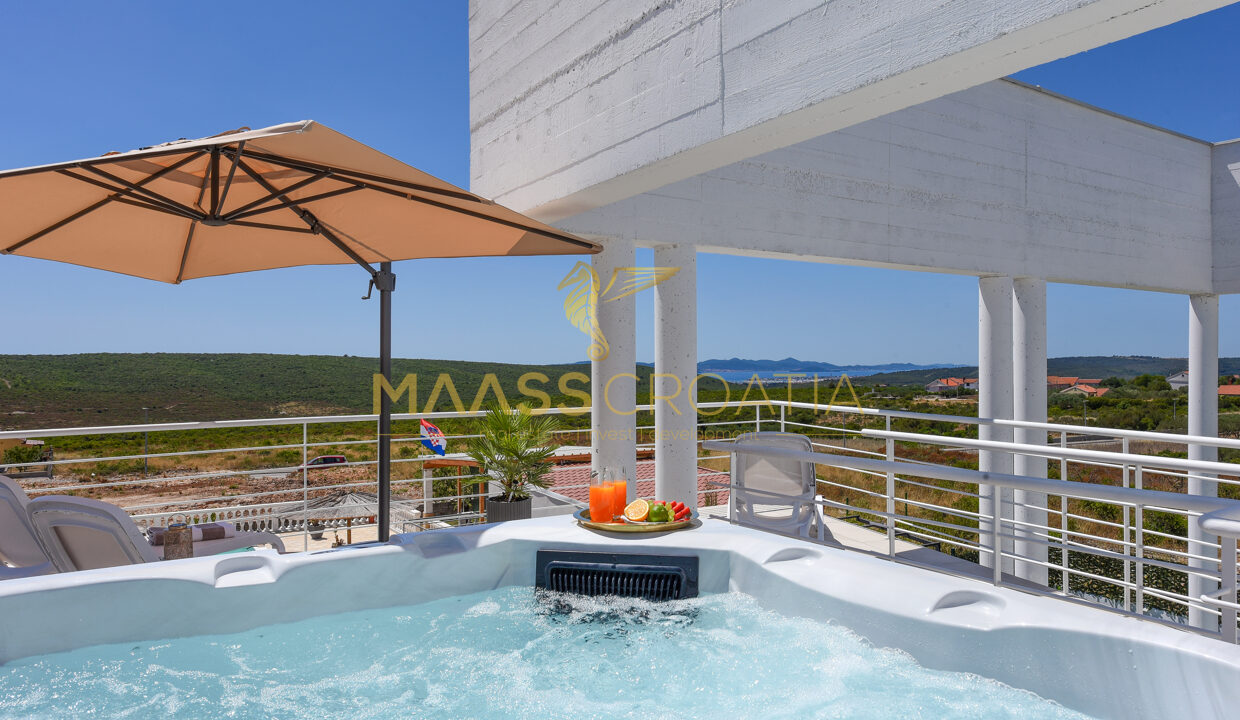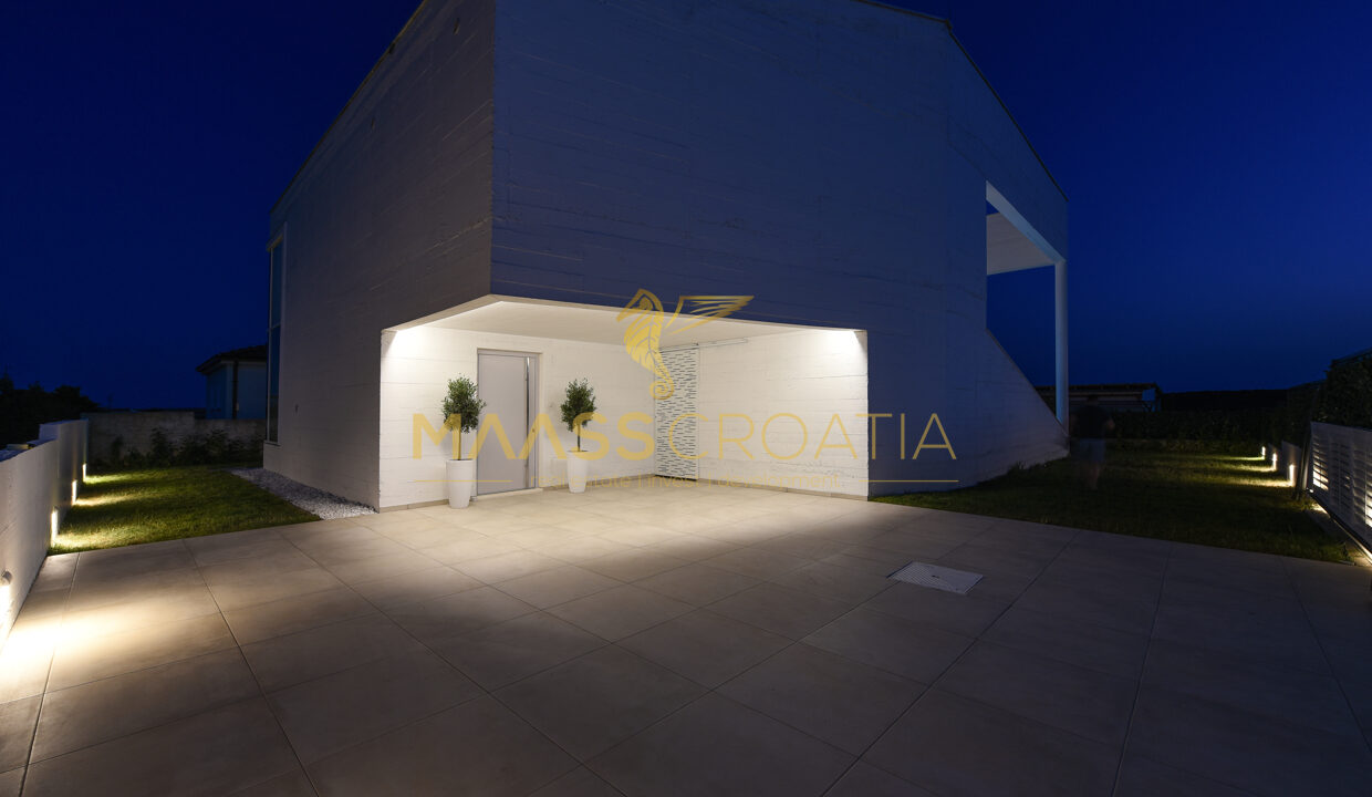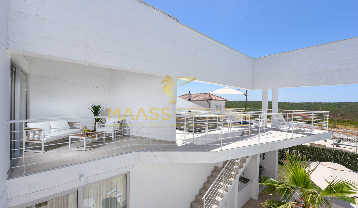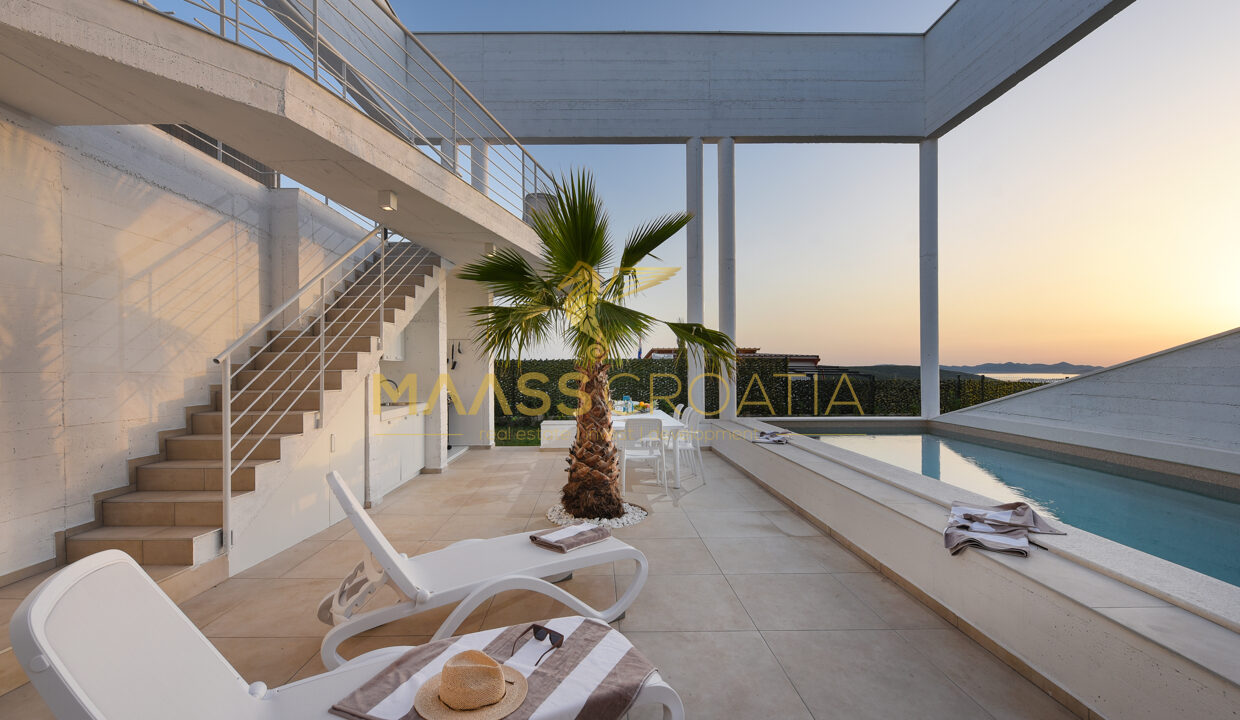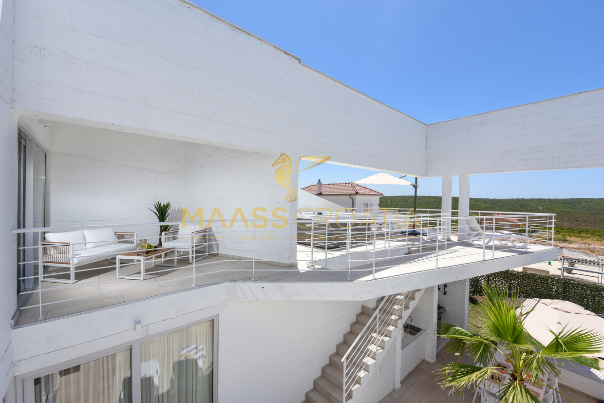 Denne unikke, moderne luksusvilla har fundet sin plads i den fredelige lille by Debeljak, tæt på Zadar. Den er beliggende langt væk fra hverdagens stress og trafik i de større byer. Fra alle sider af villaen er der en rig panoramaudsigt over grønne landskaber, bakker samt havet og øerne. Denne villa er det perfekte valg for dem, der ønsker at leve et stille liv i et lokalt fællesskab – med garanteret privatliv og sindsro, da ejendommen ligger helt afsides.