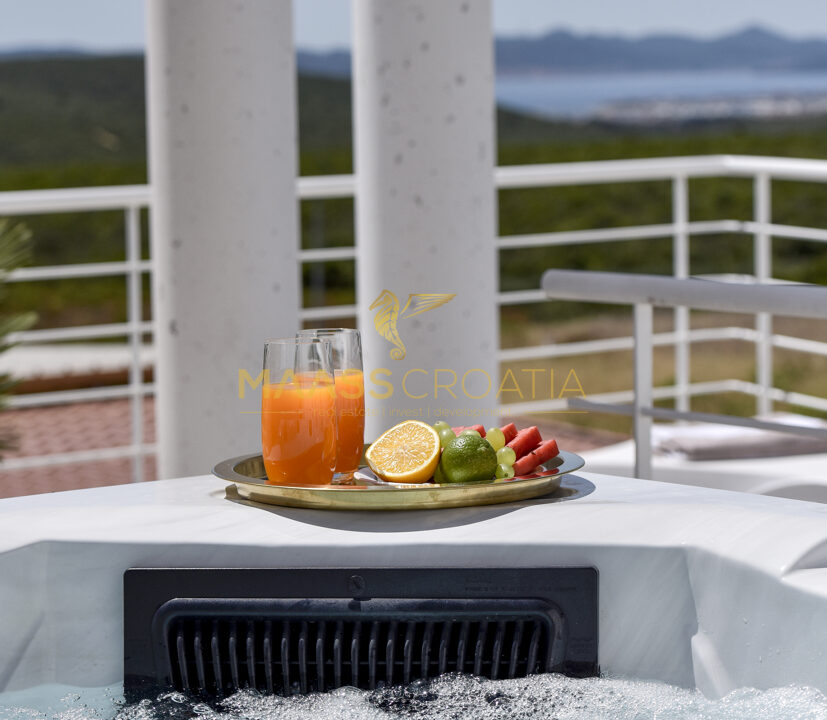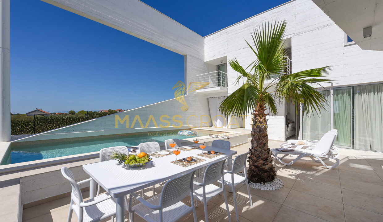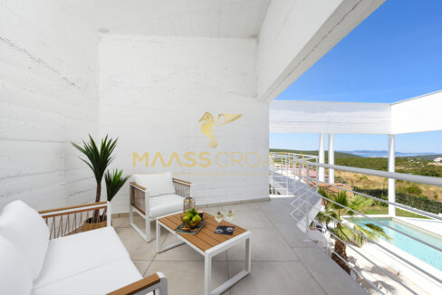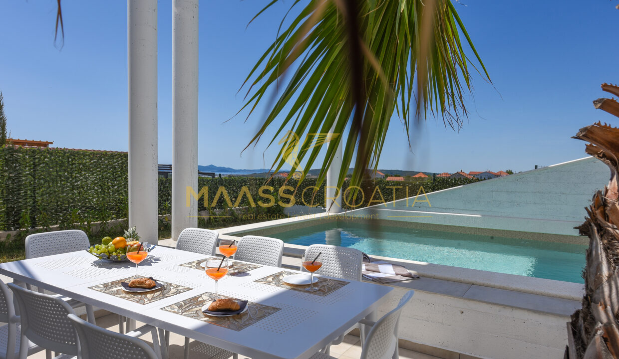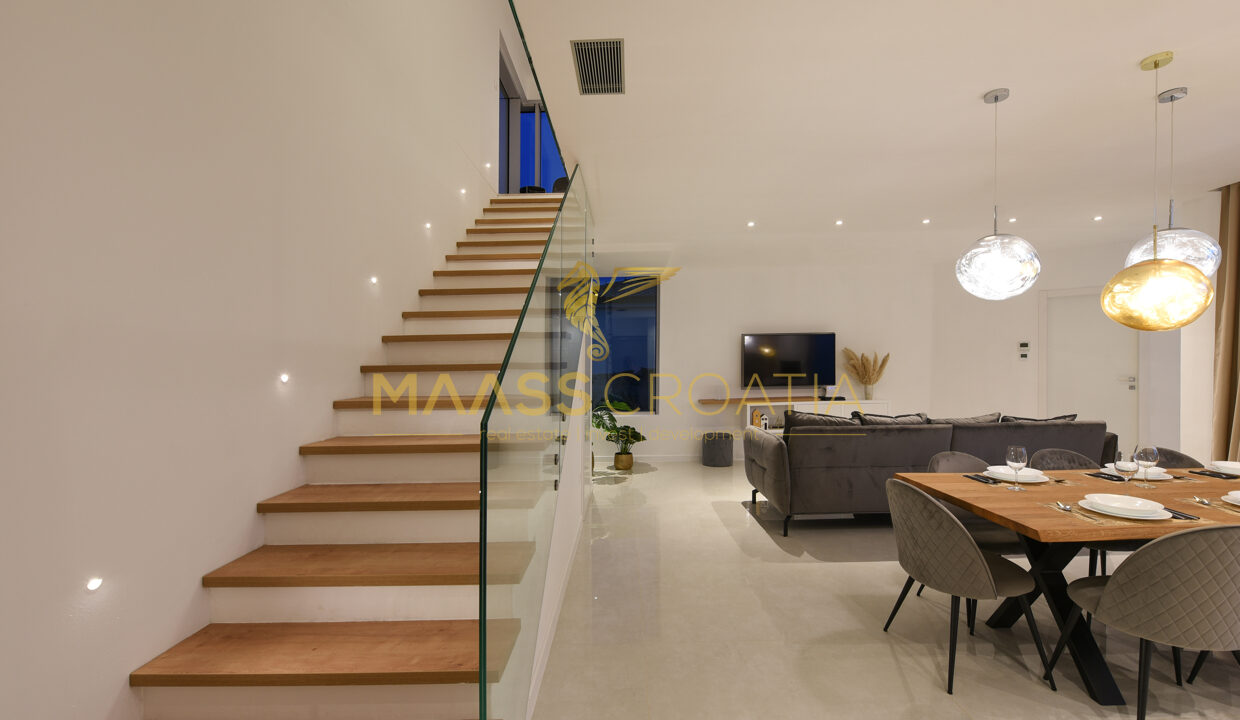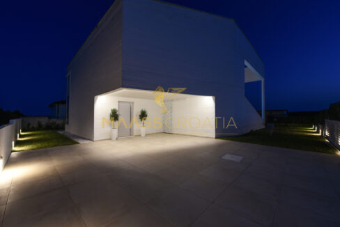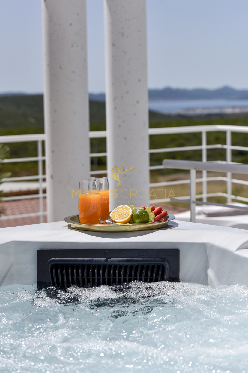 Denne unikke, moderne luksusvilla har fundet sin plads i den fredelige lille by Debeljak, tæt på Zadar. Den er beliggende langt væk fra hverdagens stress og trafik i de større byer. Fra alle sider af villaen er der en rig panoramaudsigt over grønne landskaber, bakker samt havet og øerne. Denne villa er det perfekte valg for dem, der ønsker at leve et stille liv i et lokalt fællesskab – med garanteret privatliv og sindsro, da ejendommen ligger helt afsides.