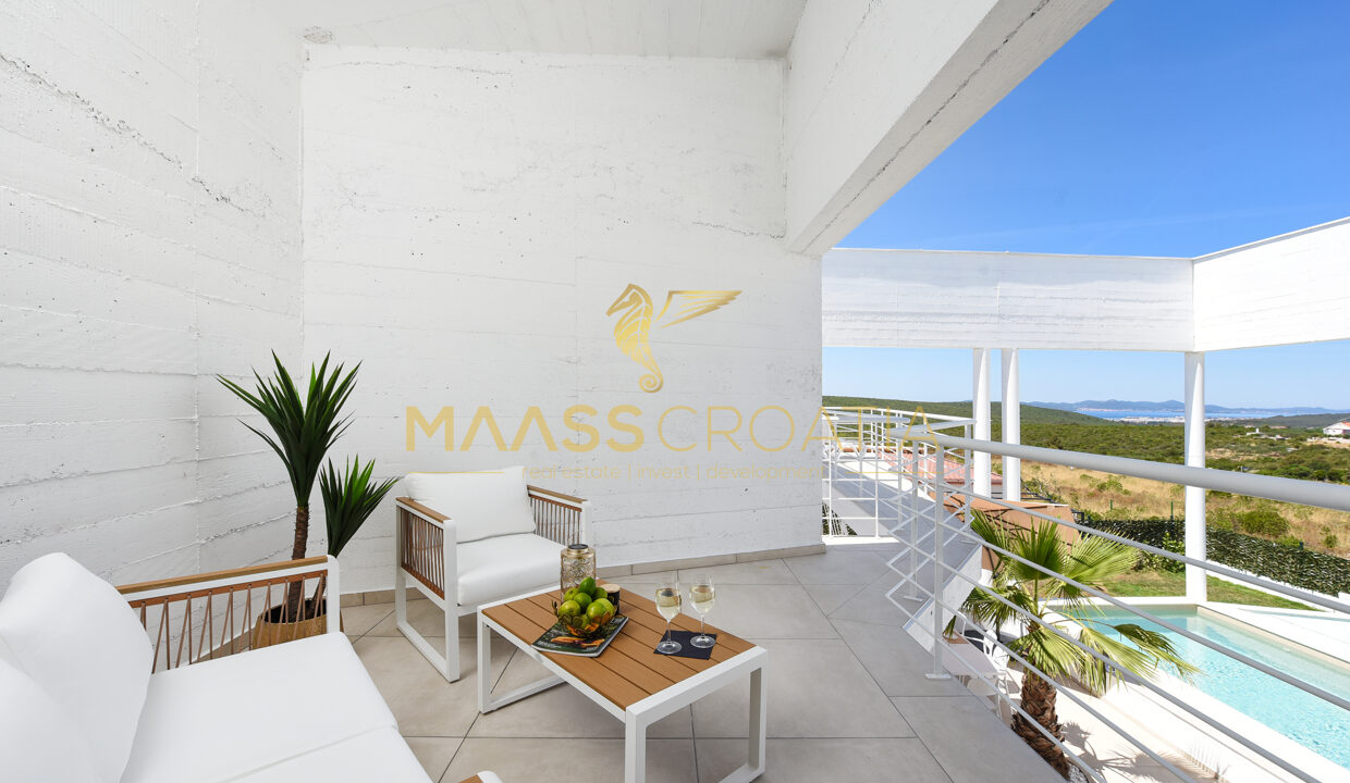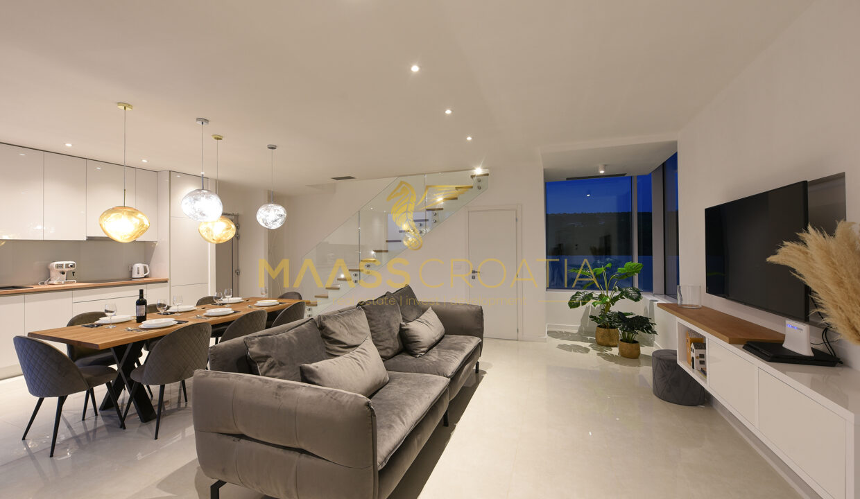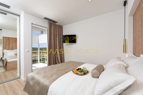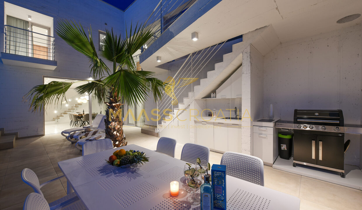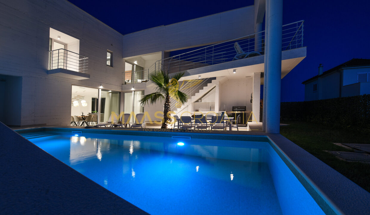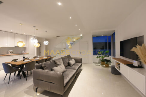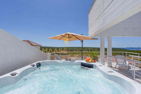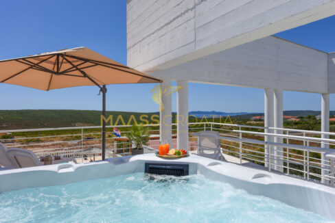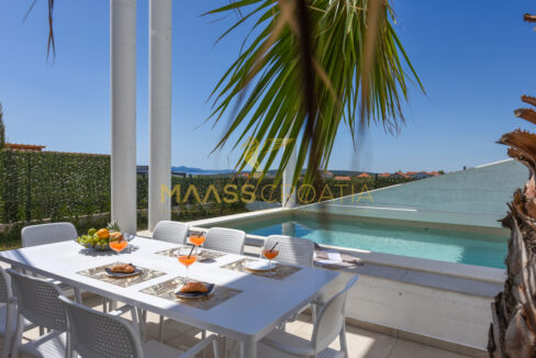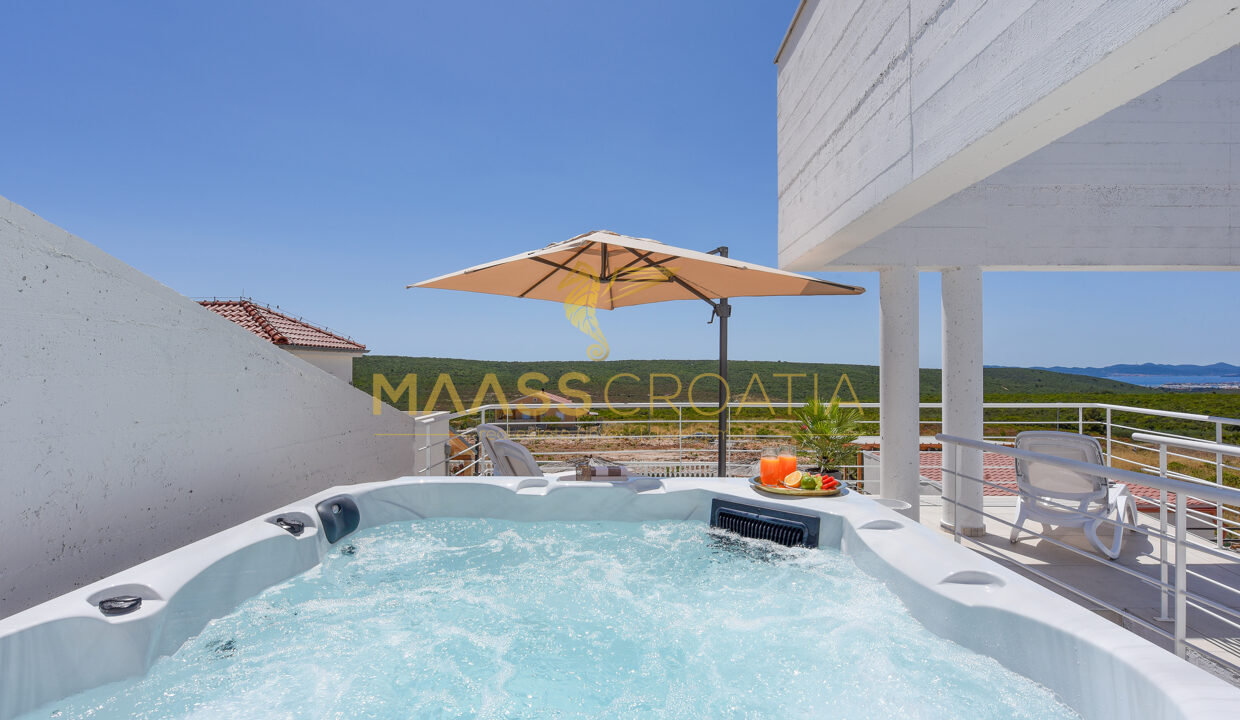 Denne unikke, moderne luksusvilla har fundet sin plads i den fredelige lille by Debeljak, tæt på Zadar. Den er beliggende langt væk fra hverdagens stress og trafik i de større byer. Fra alle sider af villaen er der en rig panoramaudsigt over grønne landskaber, bakker samt havet og øerne. Denne villa er det perfekte valg for dem, der ønsker at leve et stille liv i et lokalt fællesskab – med garanteret privatliv og sindsro, da ejendommen ligger helt afsides.