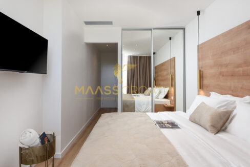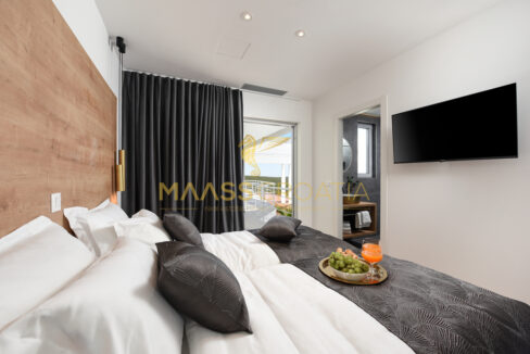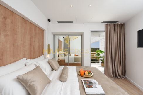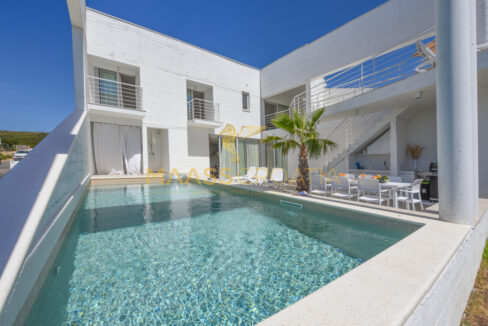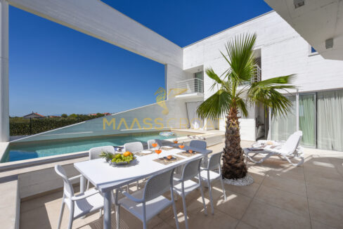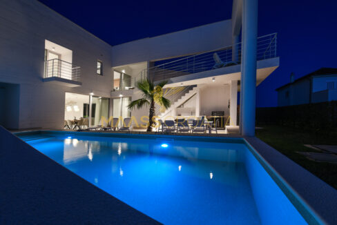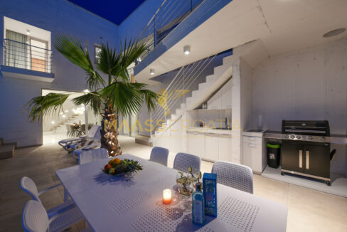 Villaen ligger på en grund med et samlet areal på 500 m², og har 200 m² beboelsesareal. I stueetagen findes der ét soveværelse med eget badeværelse og toilet, en spisestue, en stue og et køkken. På billederne ses også trappen, der fører til første sal, hvor der er yderligere tre en-suite soveværelser med tilhørende altaner. På samme etage er der en stor jacuzzi, som byder på en rummelig panoramaudsigt samt udsigt til den 32 m² store pool, der ligger i stueetagen.