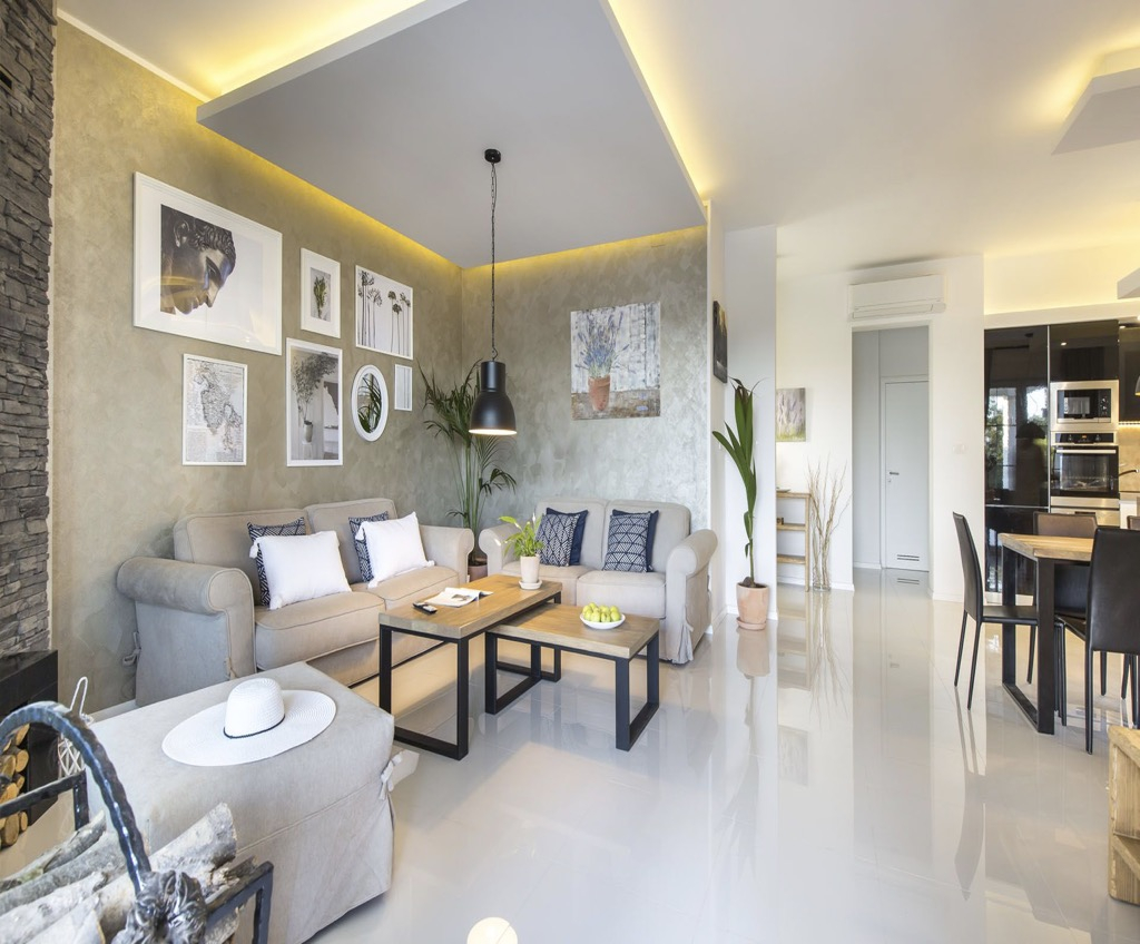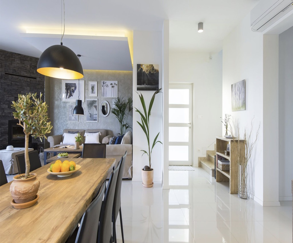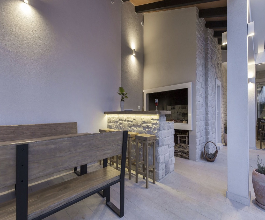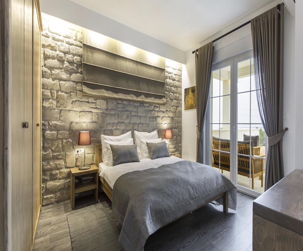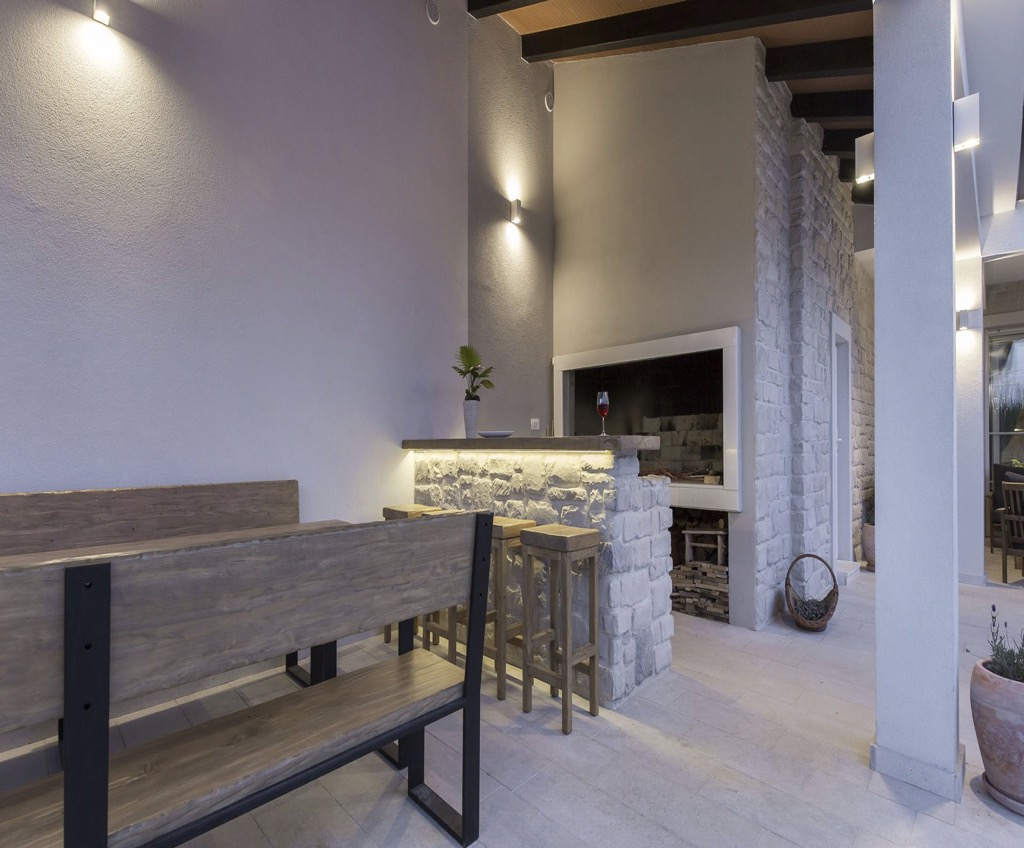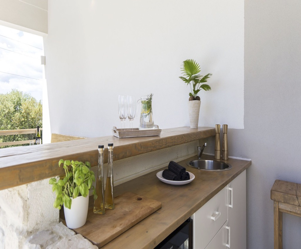Indretningen er enkel og minimalistisk, men dekoreret med naturlige materialer som sten og hårdttræ, hvilket giver huset en ægte middelhavsfølelse.