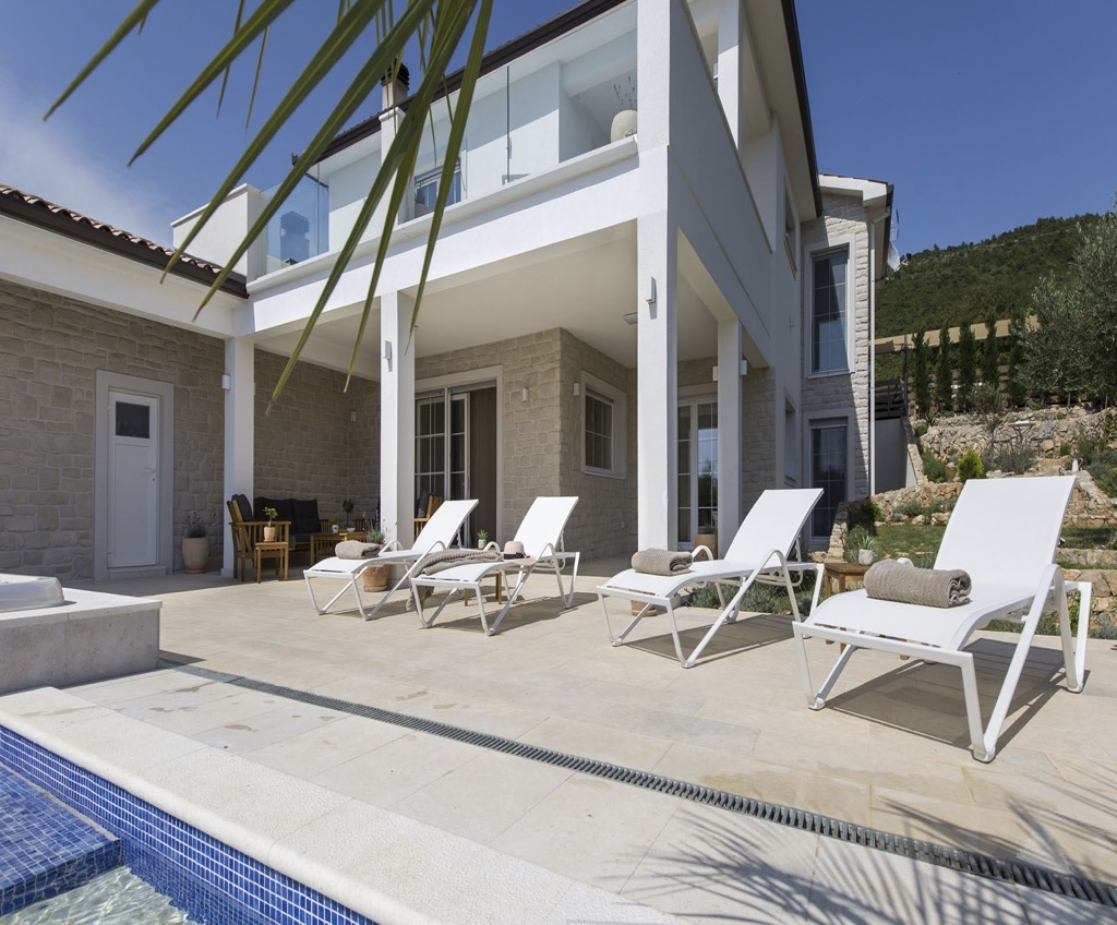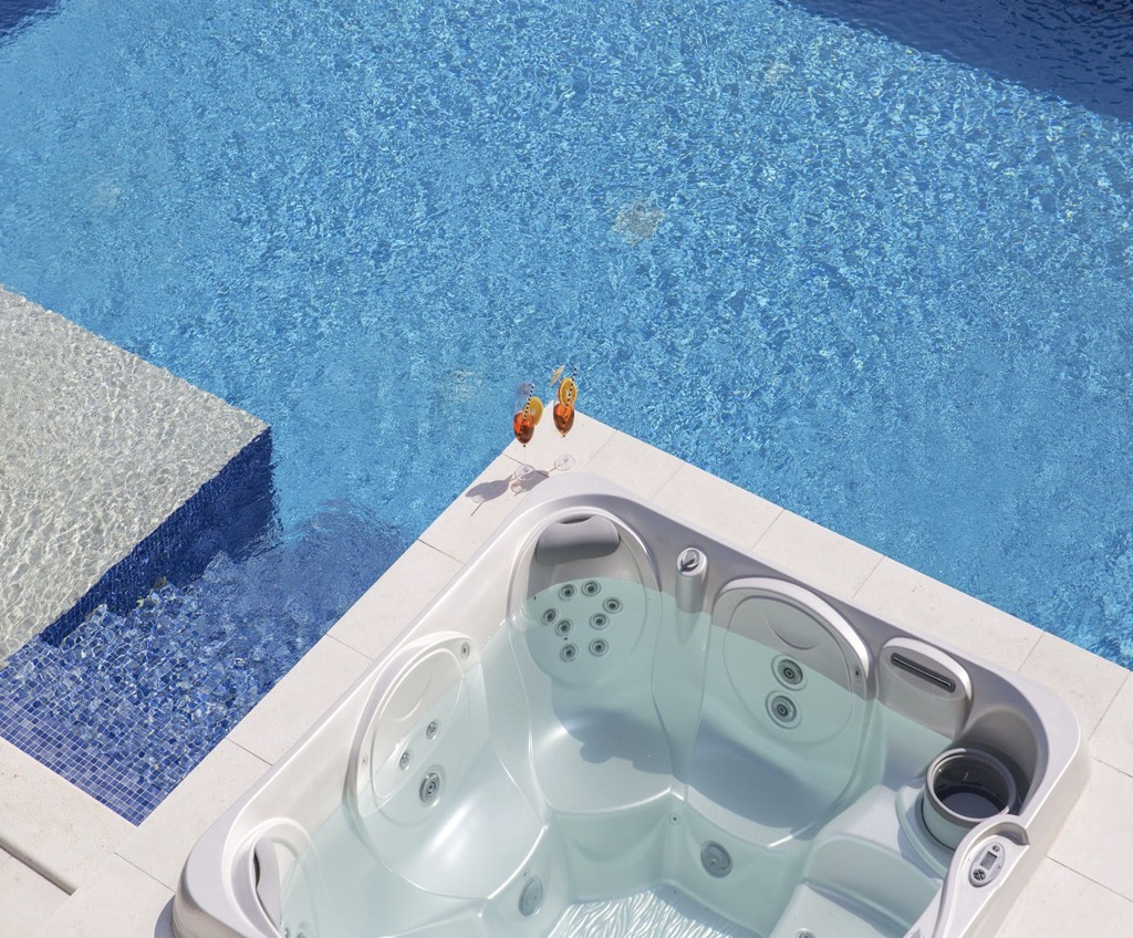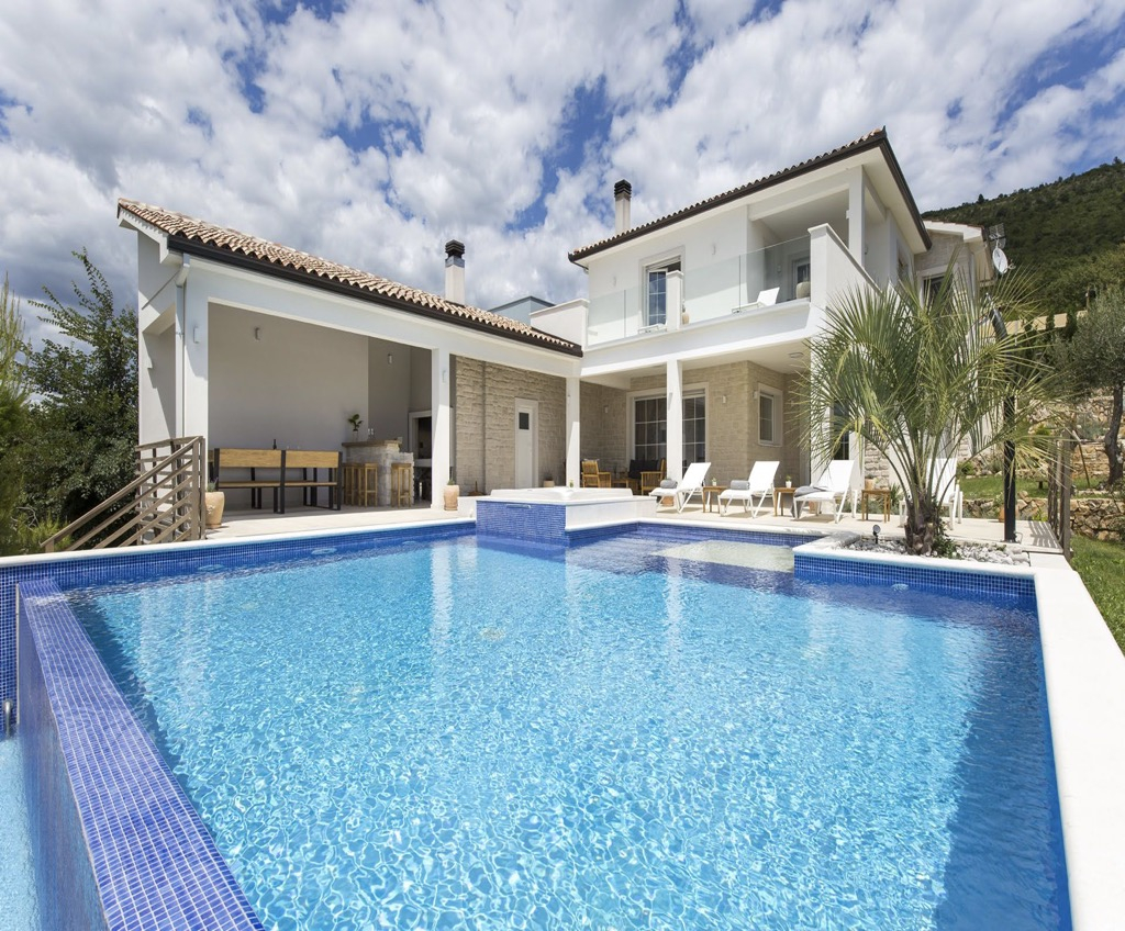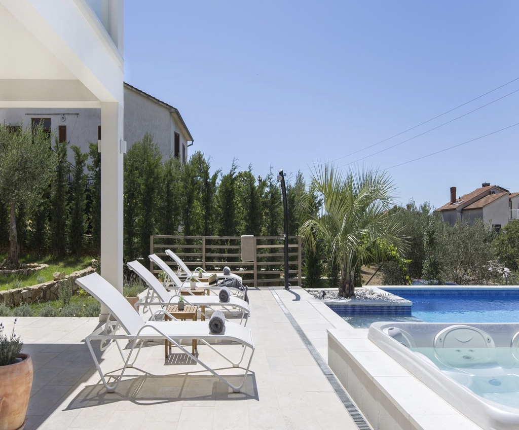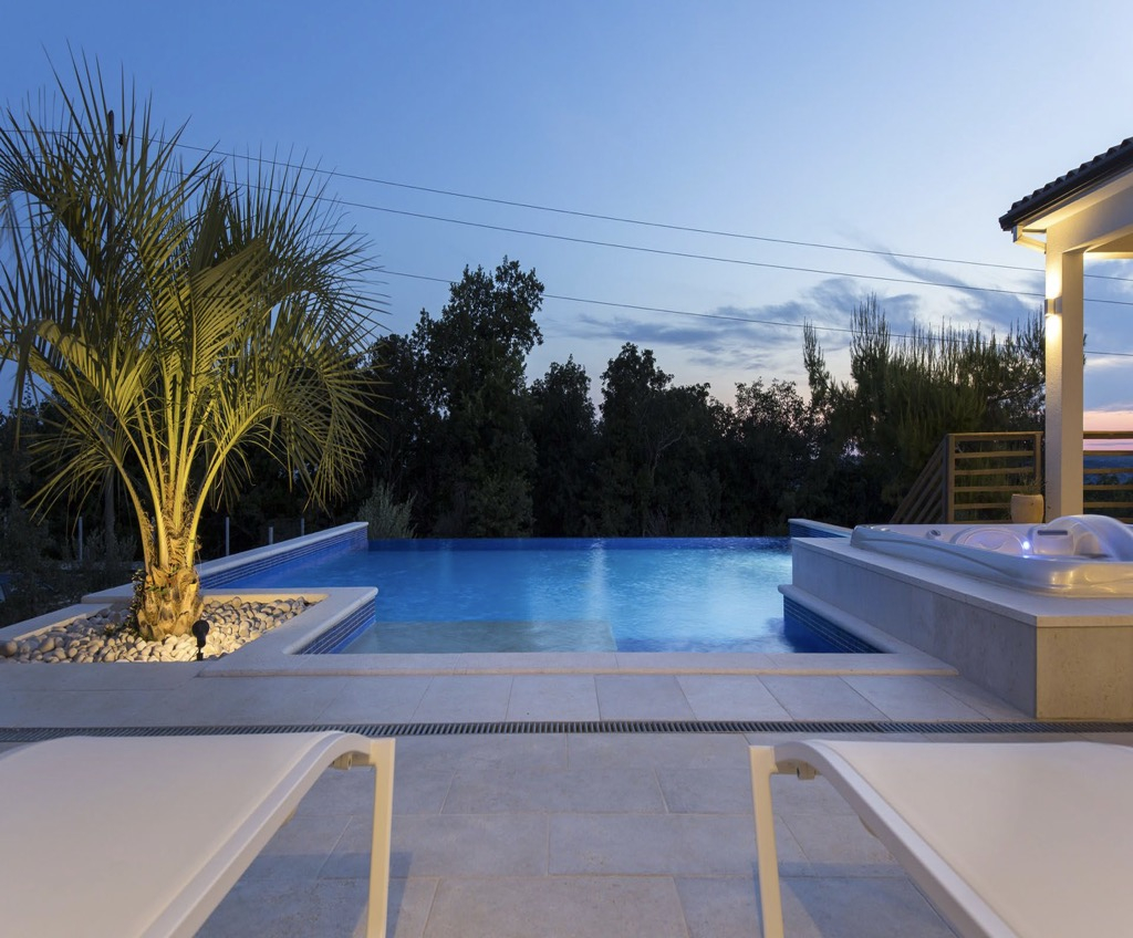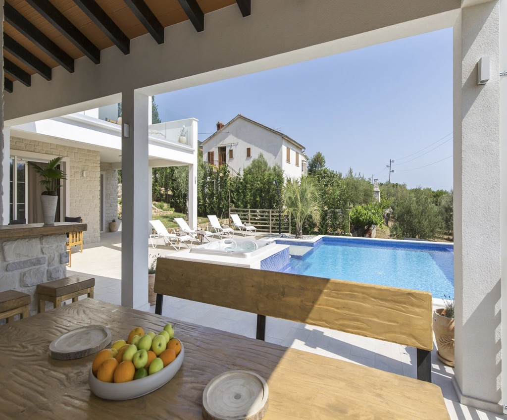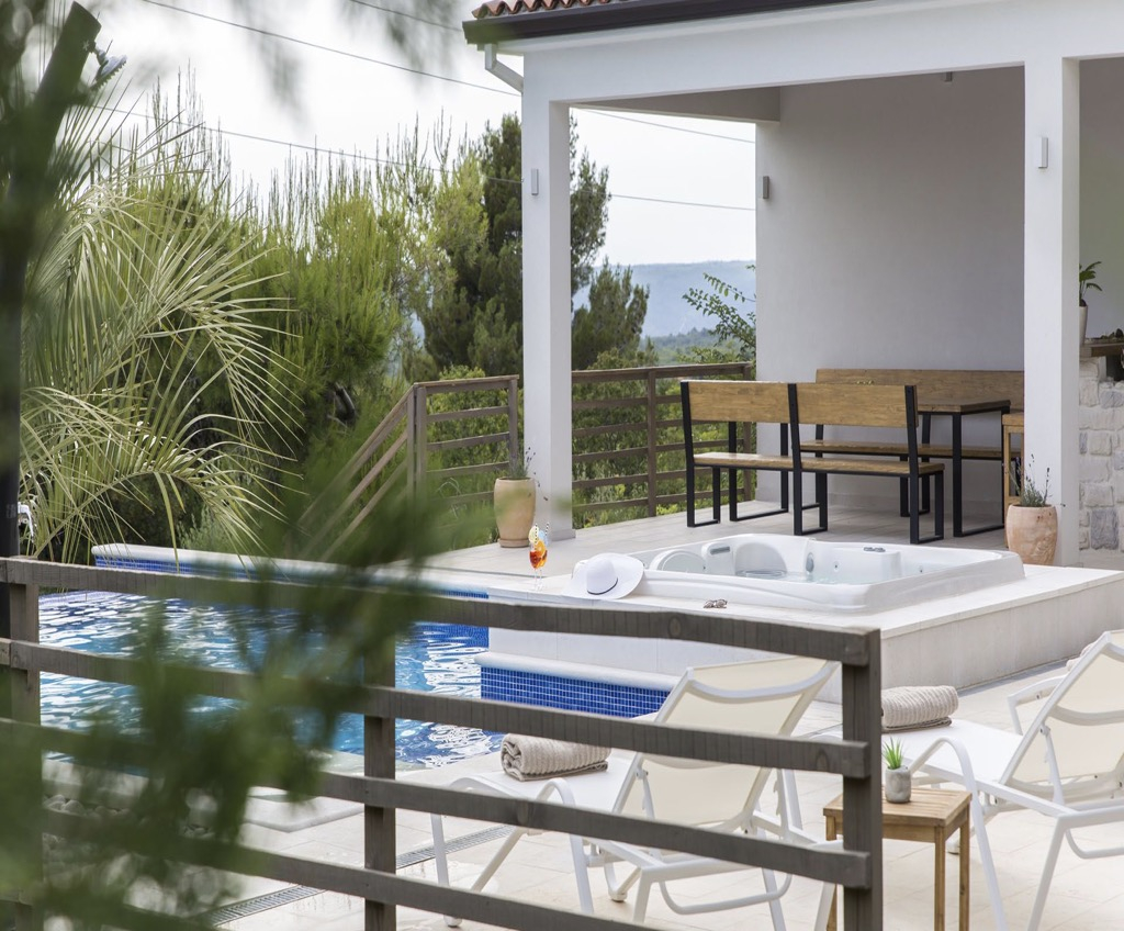 Der er en swimmingpool med indbygget spabad, der er direkte forbundet med terrassen og loungeområdet.