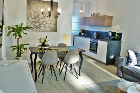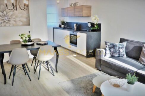 Hver lejlighed består af en stue med køkken og spiseområde, to soveværelser og et badeværelse.