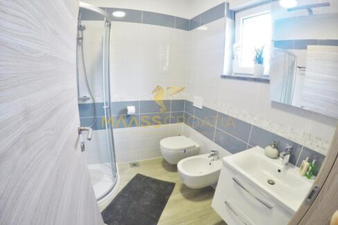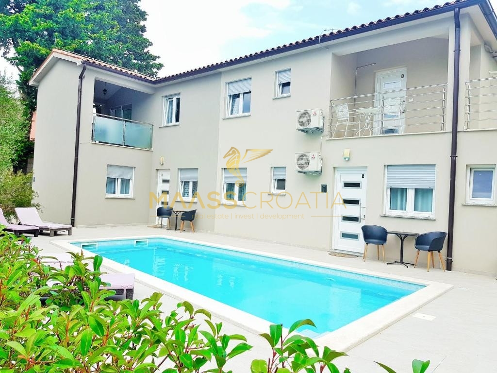 Den villa, der blev opført i 2017, strækker sig over to etager og består af fire separate lejligheder, hver med egen indgang.