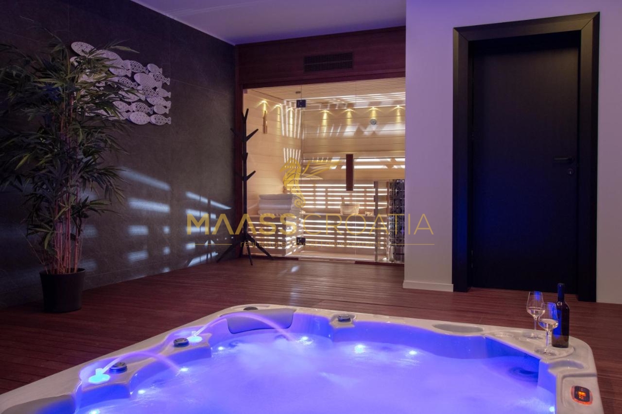 Villaen har i alt 4 soveværelser, store stuer og et smukt spa-område med jacuzzi, stor sauna, minibar og billardrum. Terrassen i stueetagen er overdækket, og der er en pool med hydromassage og en swimmingpool med integreret modstrømssvømning. Det er tilgængeligt herfra.
