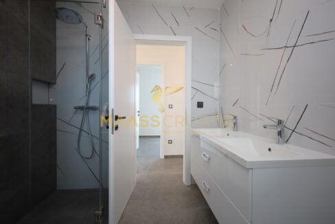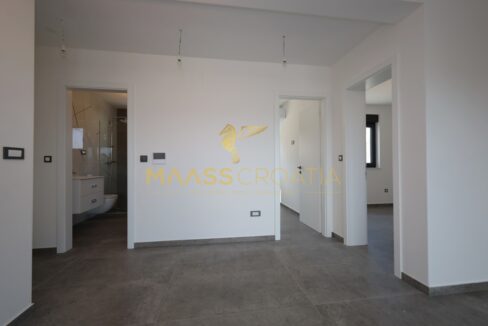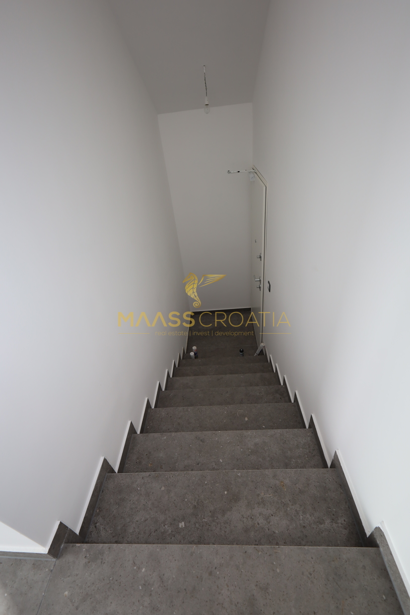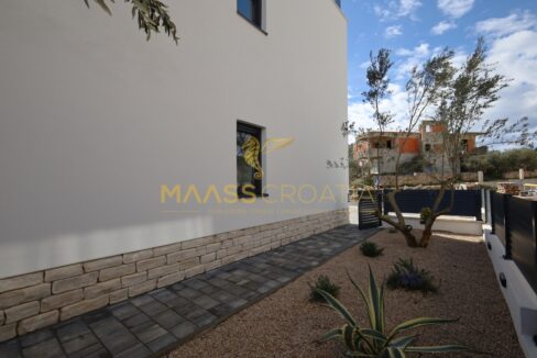 Nybygget boligbygning på øen Murter med smuk havudsigt, bestående af tre etager.