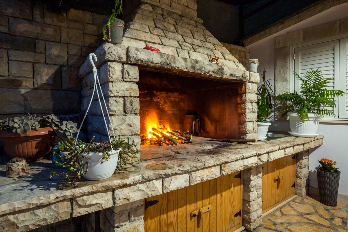 På terrassen i stueetagen, lige ved siden af swimmingpoolen, er der en stengrill til sociale sammenkomster.