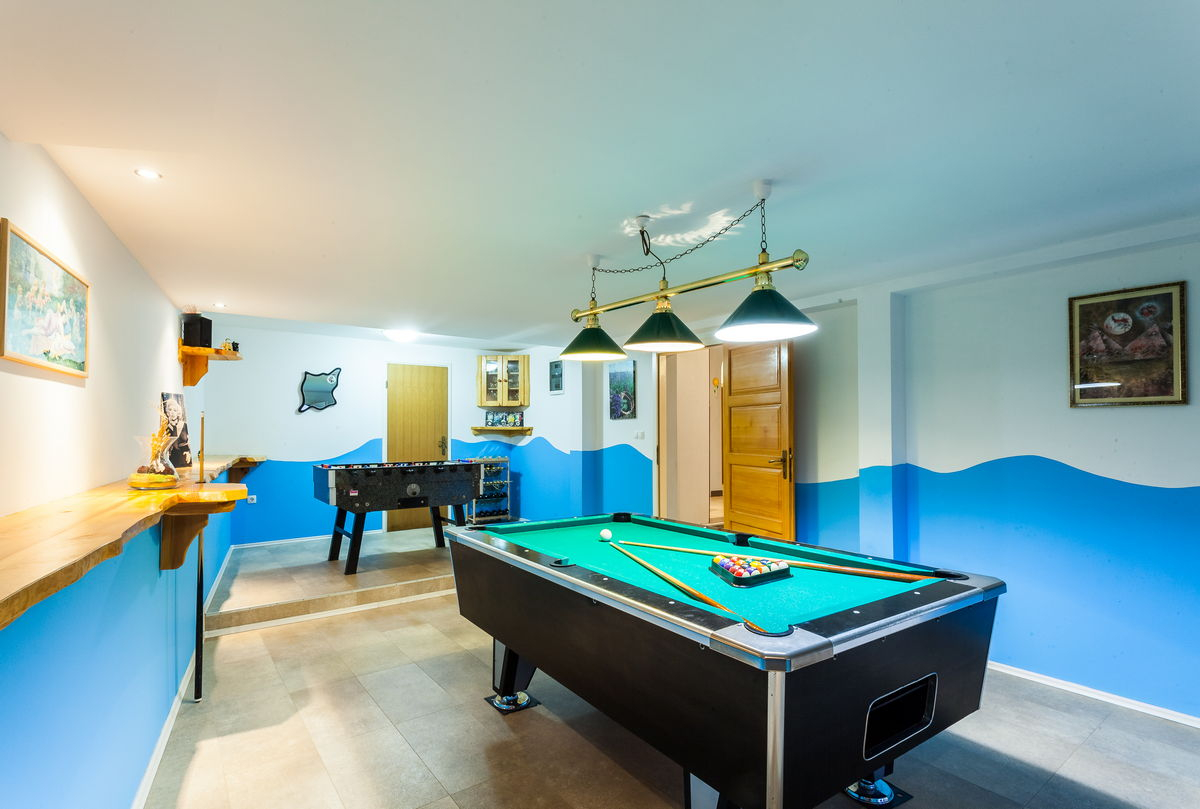 Den rummelige opholdsstue og hele husets interiør er meget moderne og stilfuldt, fuldt udstyret med elegante og moderne apparater. En ekstra bonus ved dette hus er et ekstra spillerum med et poolbord, der sikrer, at du altid har masser af plads til underholdning.