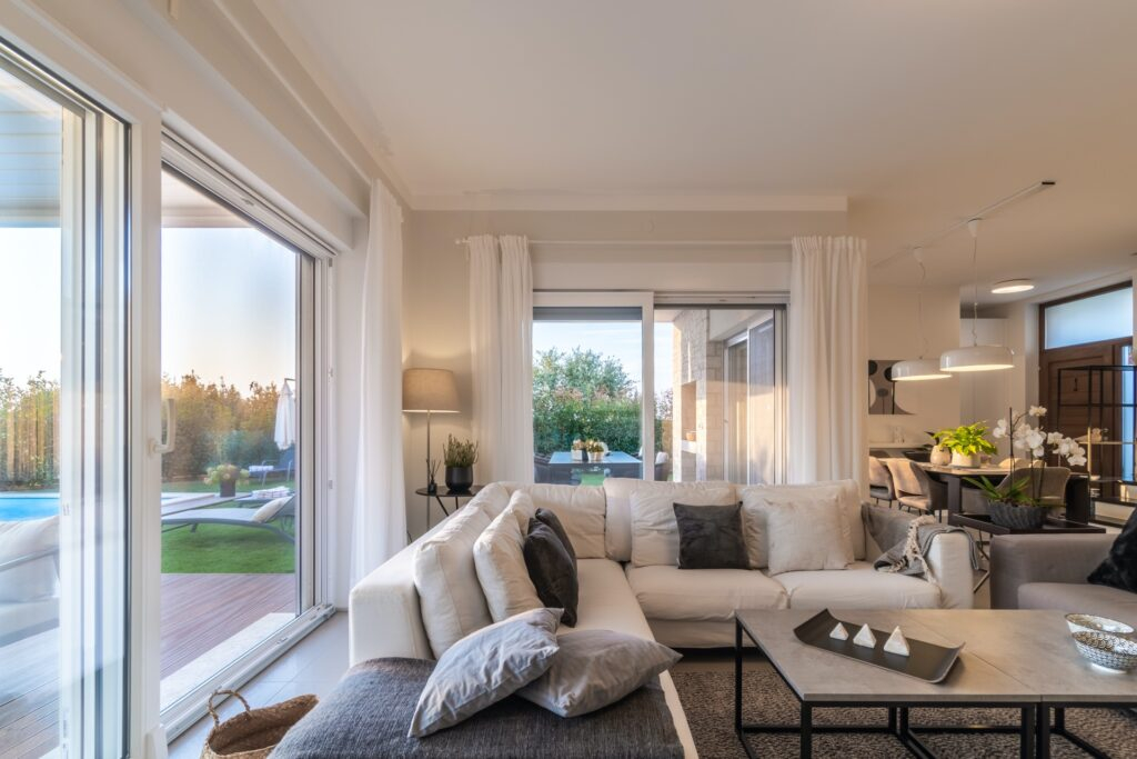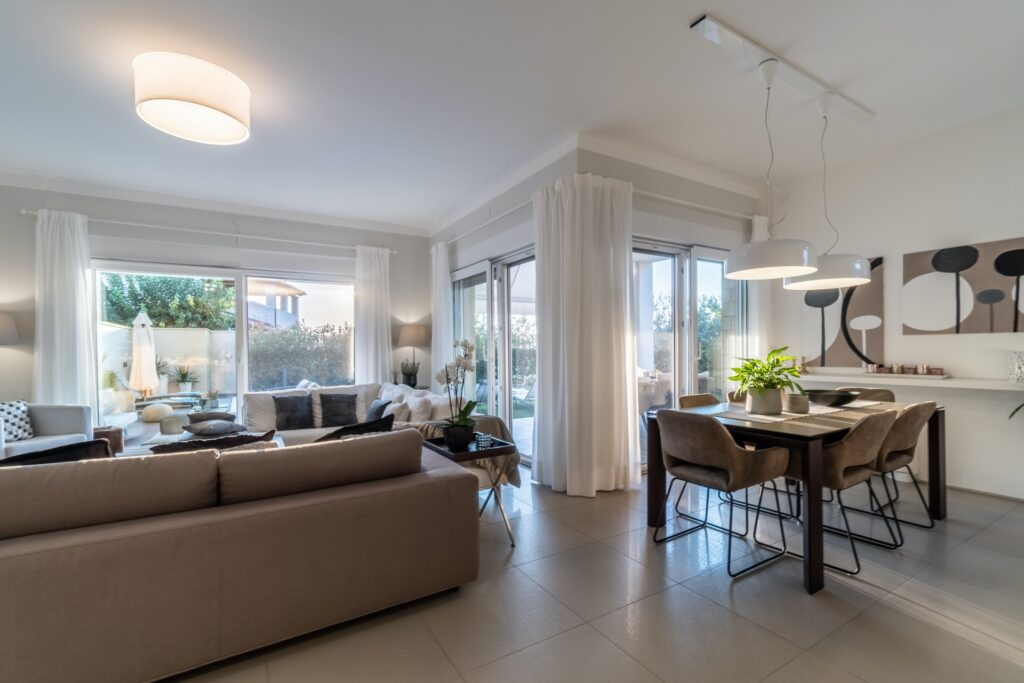 Det luksuriøse og elegante præg i den gennemtænkte planløsning giver hele ejendommen et sofistikeret udseende. Dette rummelige koncept forbliver yderst funktionelt, samtidig med at det føles lyst og luftigt.