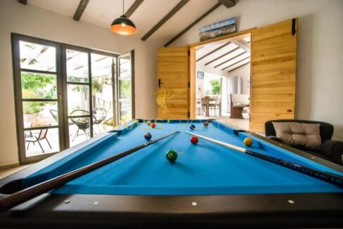 Det har et udendørs køkken og en ekstra pejs, plus der er et sjovt værelse med et poolbord, dart og bordfodbold.